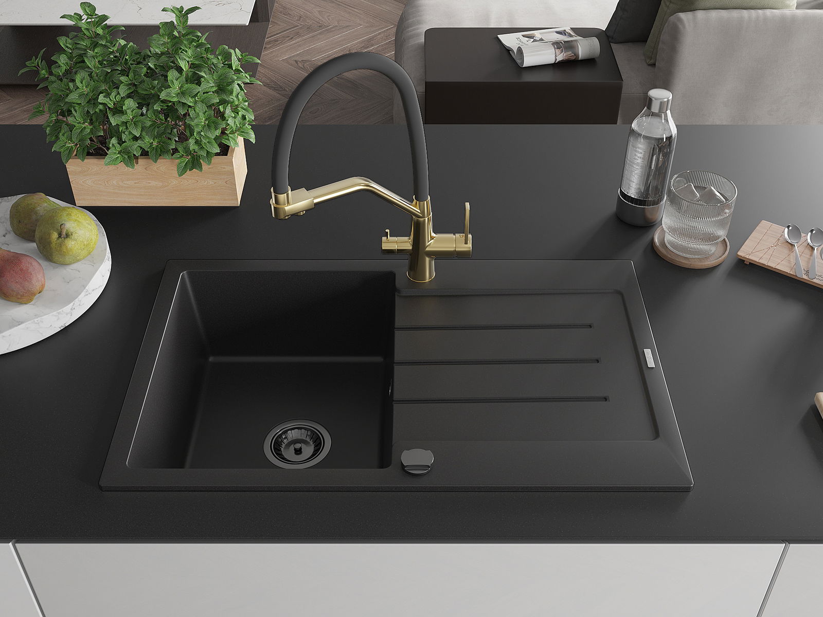 Mexen Bruno évier en granit 1 bac avec égouttoir et robinet de cuisine Duo, noir - 6513-77-671701-57-B