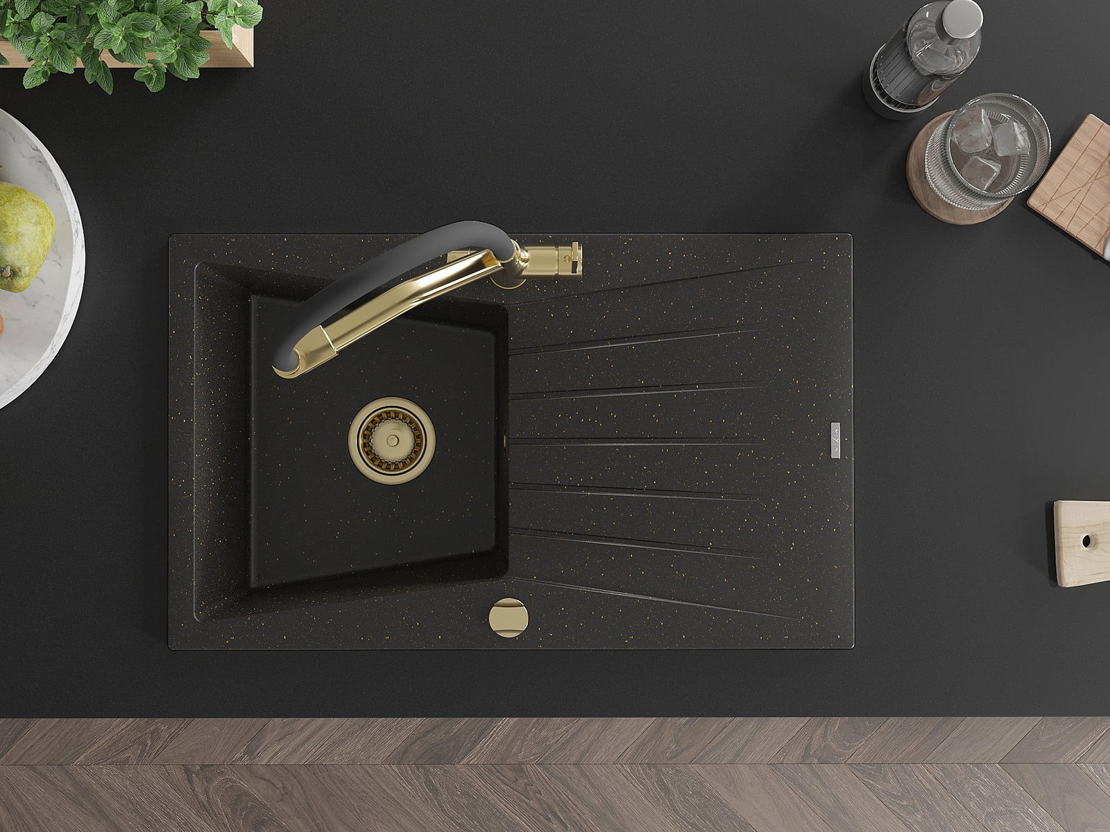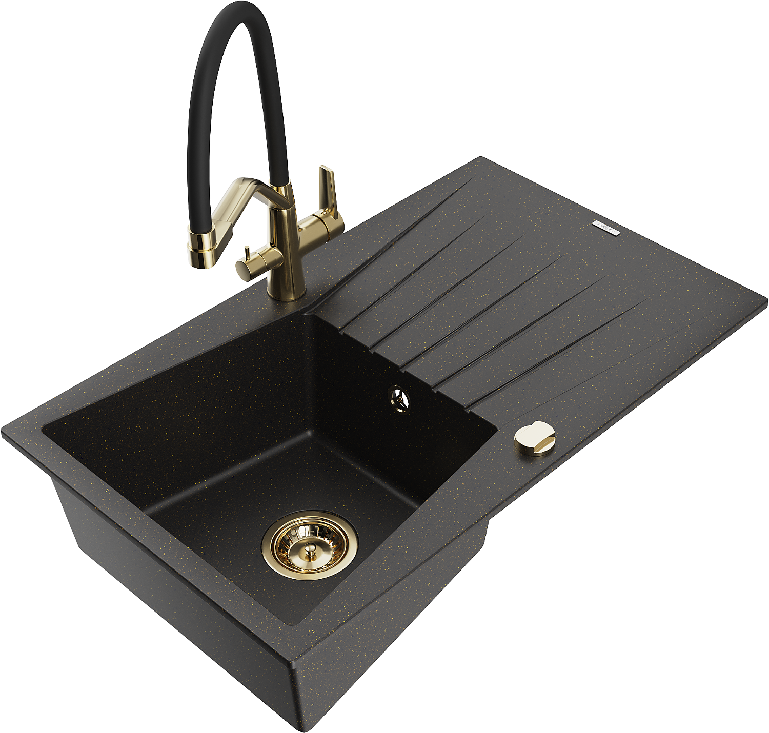 Mexen Cesar évier en granit 1 bac avec égouttoir et robinet de cuisine Duo, noir/doré métallique - 6514-75-671701-57-G