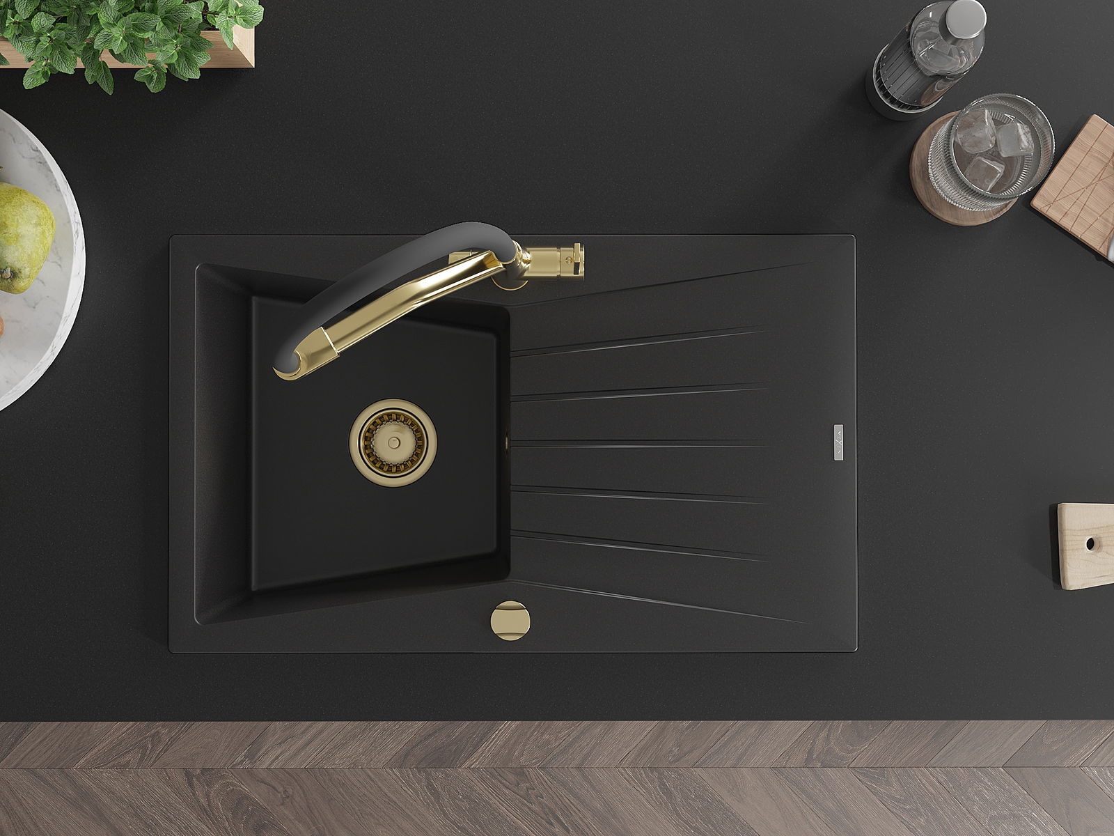 Mexen Cesar évier en granit à 1 bac avec égouttoir et robinet de cuisine Duo, noir - 6514-77-671701-57-G