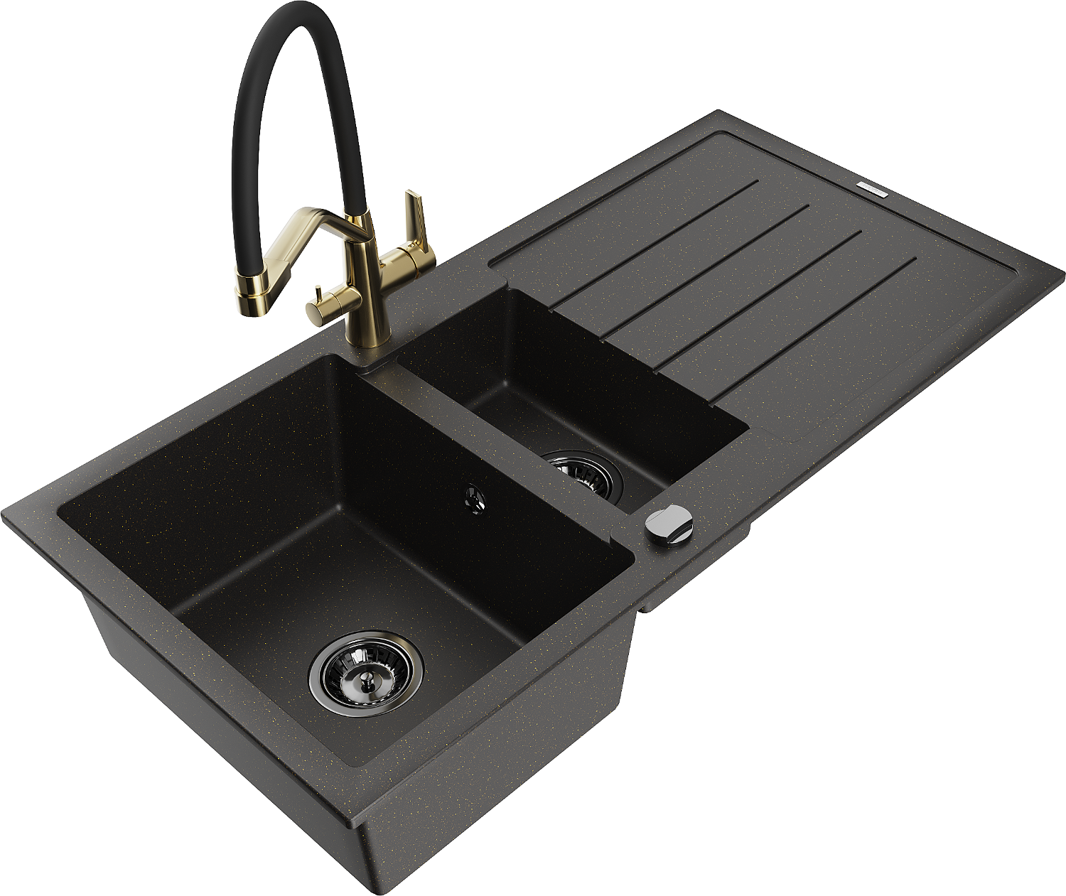 Mexen Andres évier en granit 1,5 bac avec égouttoir et robinet de cuisine Duo, noir/or métallisé - 6515-75-671701-57-B
