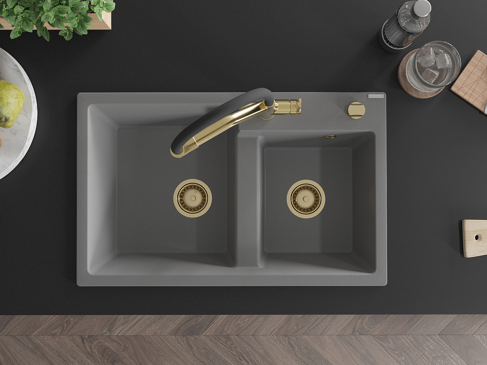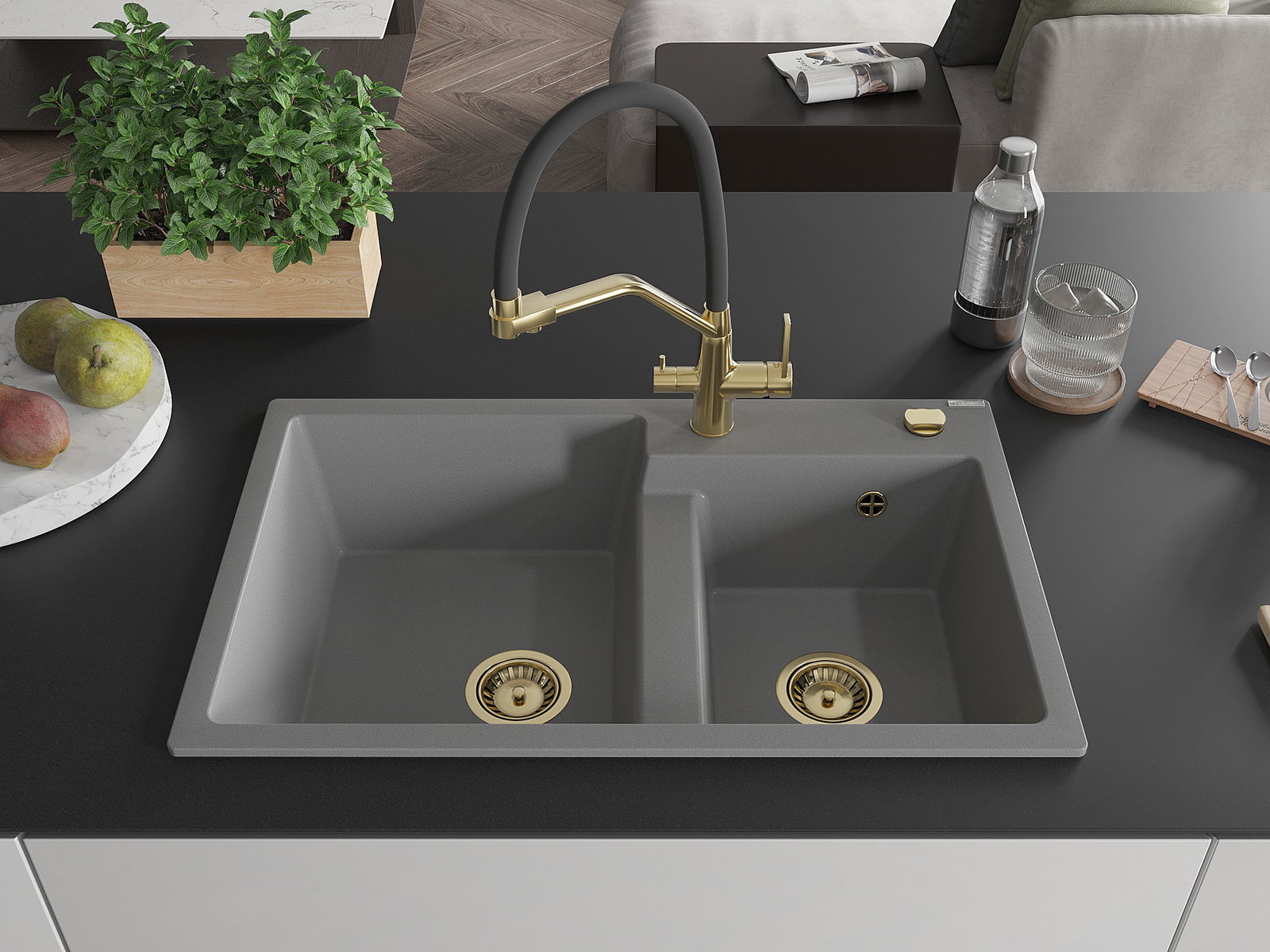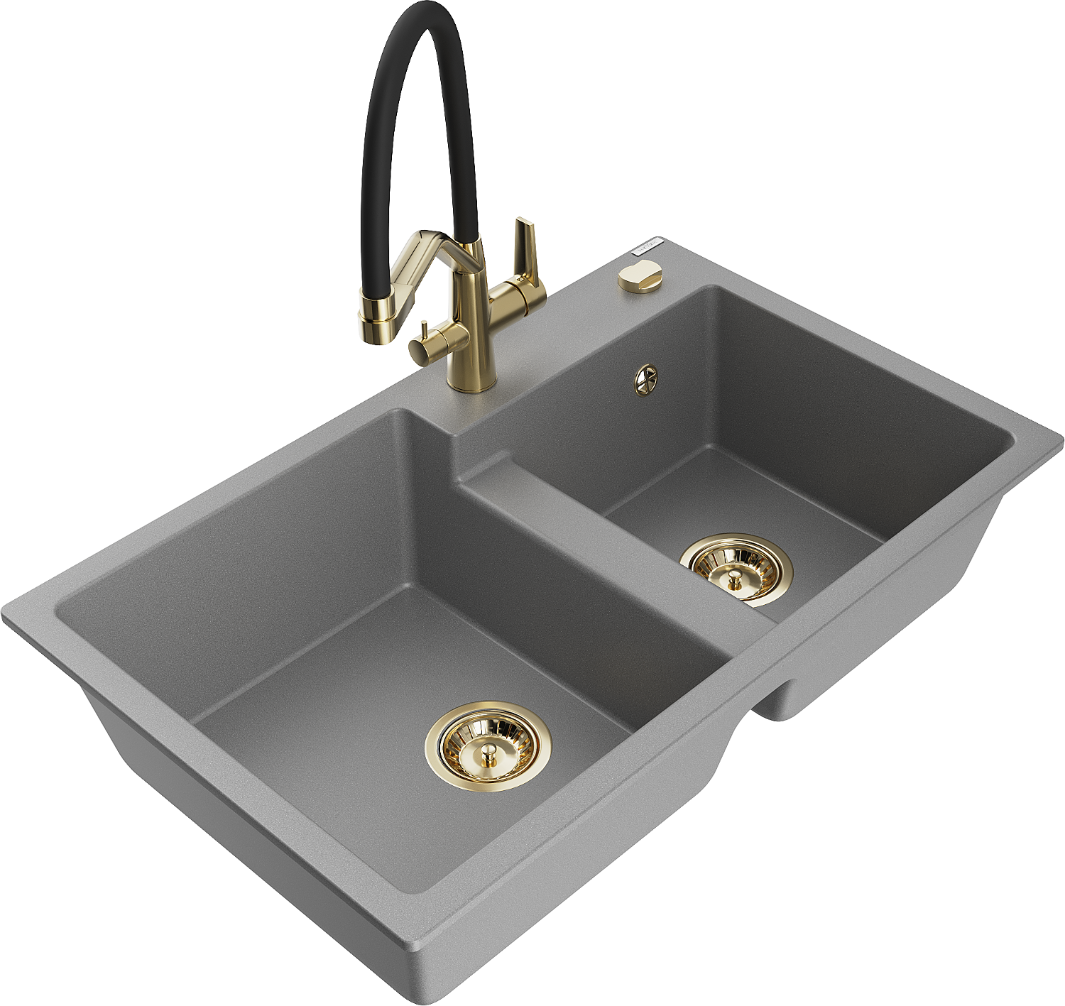 Mexen Tomas évier en granit à 2 cuves avec robinet de cuisine Duo, gris - 6516-71-671701-57-G