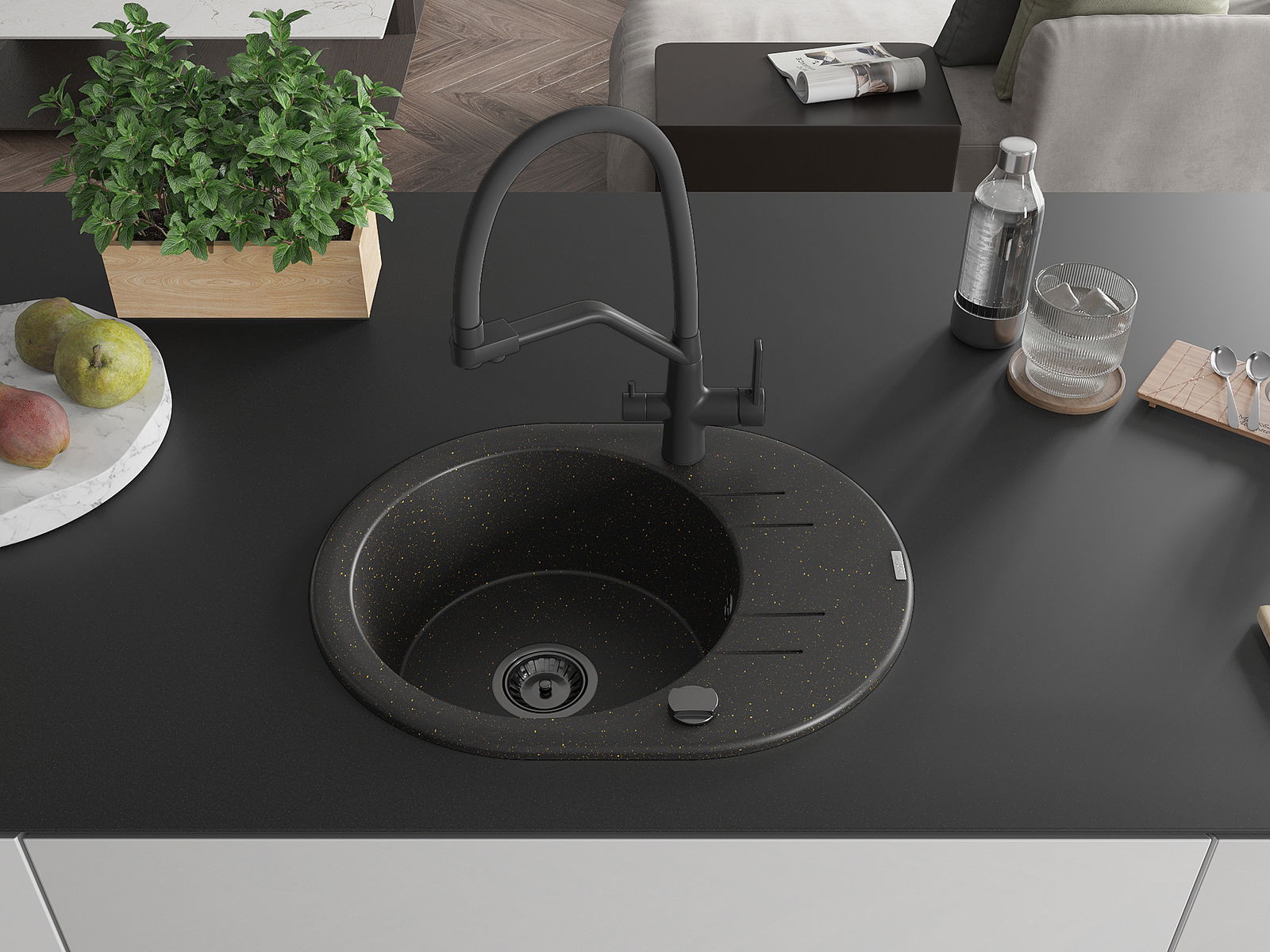 Mexen Kevin évier en granit 1 bac avec robinet de cuisine Duo, noir/or métallique - 6517-75-671701-70-B