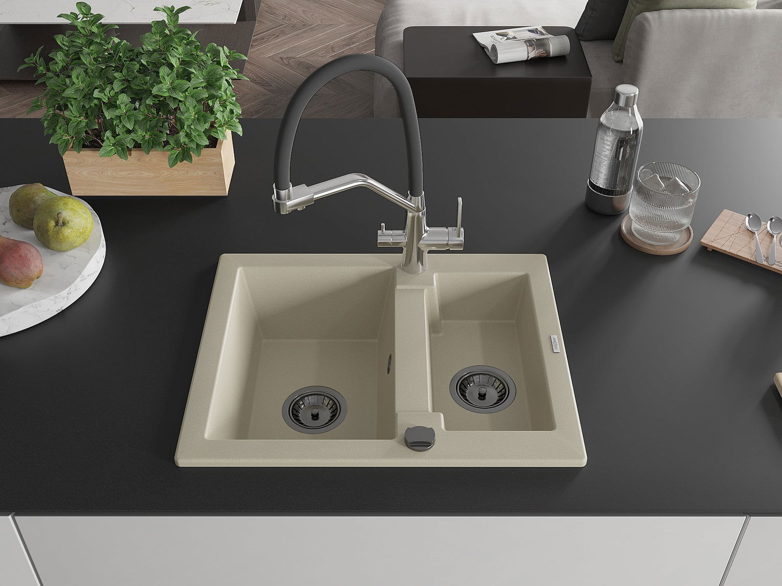 Mexen Carlos évier en granit à 1,5 bac avec robinet de cuisine Duo, beige - 6518-69-671701-07-B