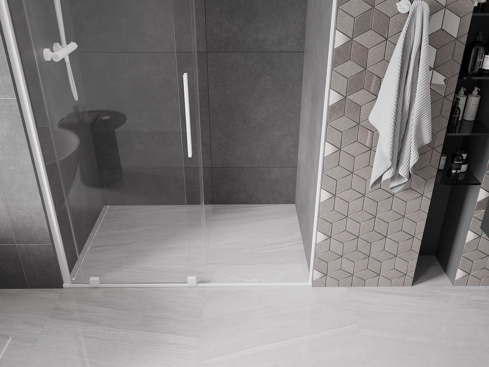 Poignée pratique et confortable en acier inoxydable. La forme moderne associée à une finition assortie à la couleur des profilés confère à l'ensemble un aspect moderne et élégant, soulignant l'esthétique de chaque salle de bain.