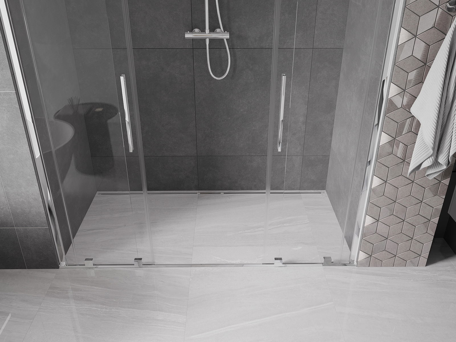 Poignée pratique et confortable en acier inoxydable. La forme moderne associée à une finition assortie à la couleur des profilés confère à l'ensemble un aspect moderne et élégant, soulignant l'esthétique de chaque salle de bain.