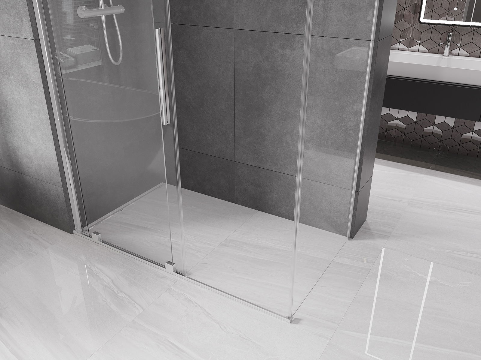 Poignée pratique et confortable en acier inoxydable. La forme moderne associée à une finition assortie à la couleur des profilés confère à l'ensemble un aspect moderne et élégant, soulignant l'esthétique de chaque salle de bain.