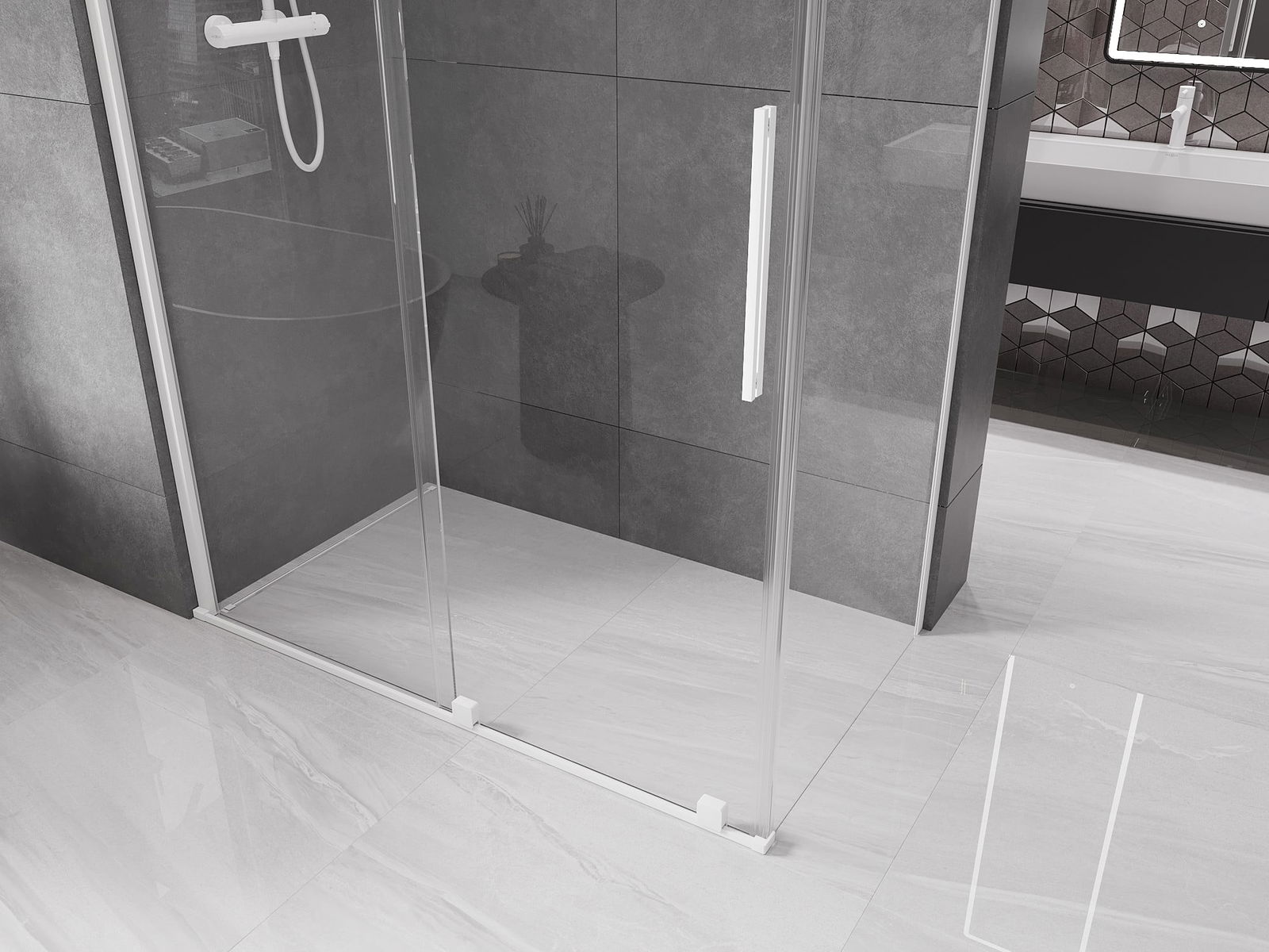 Poignée pratique et confortable en acier inoxydable. La forme moderne associée à une finition assortie à la couleur des profilés confère à l'ensemble un aspect moderne et élégant, soulignant l'esthétique de chaque salle de bain.
