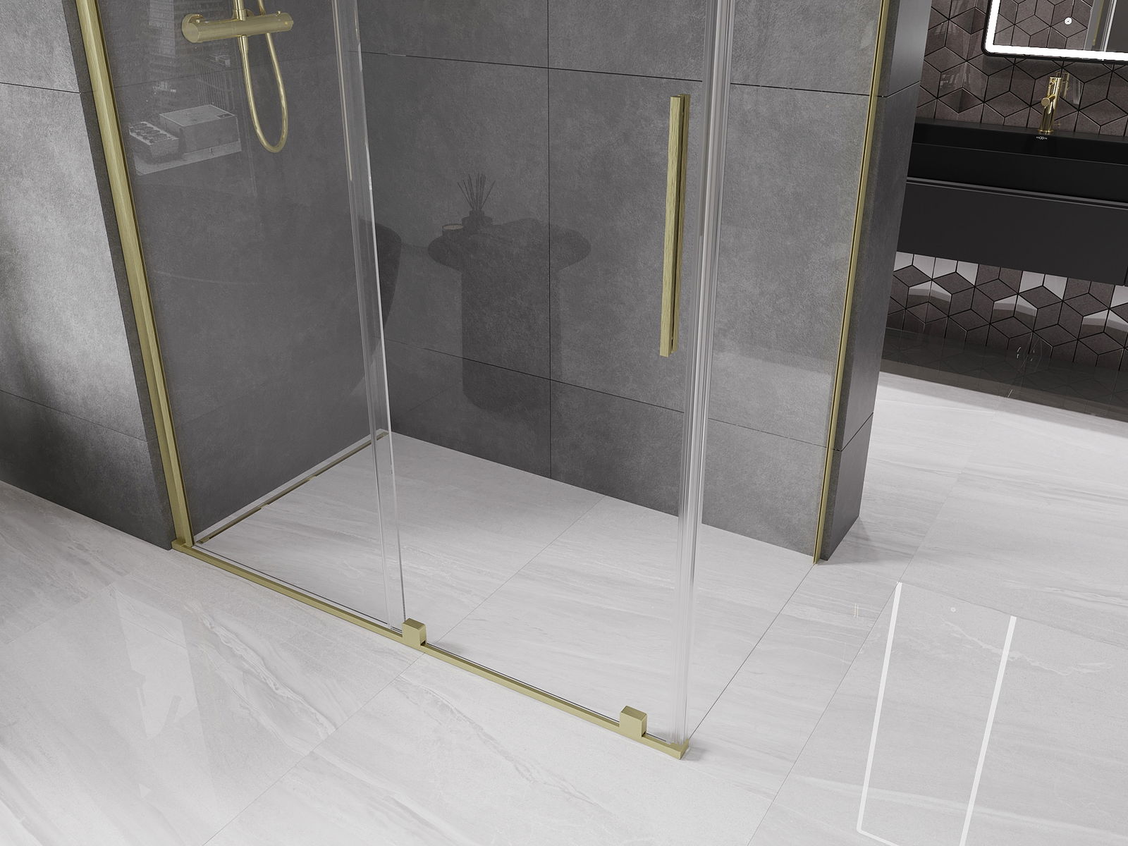 Poignée pratique et confortable en acier inoxydable. La forme moderne associée à une finition assortie à la couleur des profilés confère à l'ensemble un aspect moderne et élégant, soulignant l'esthétique de chaque salle de bain.