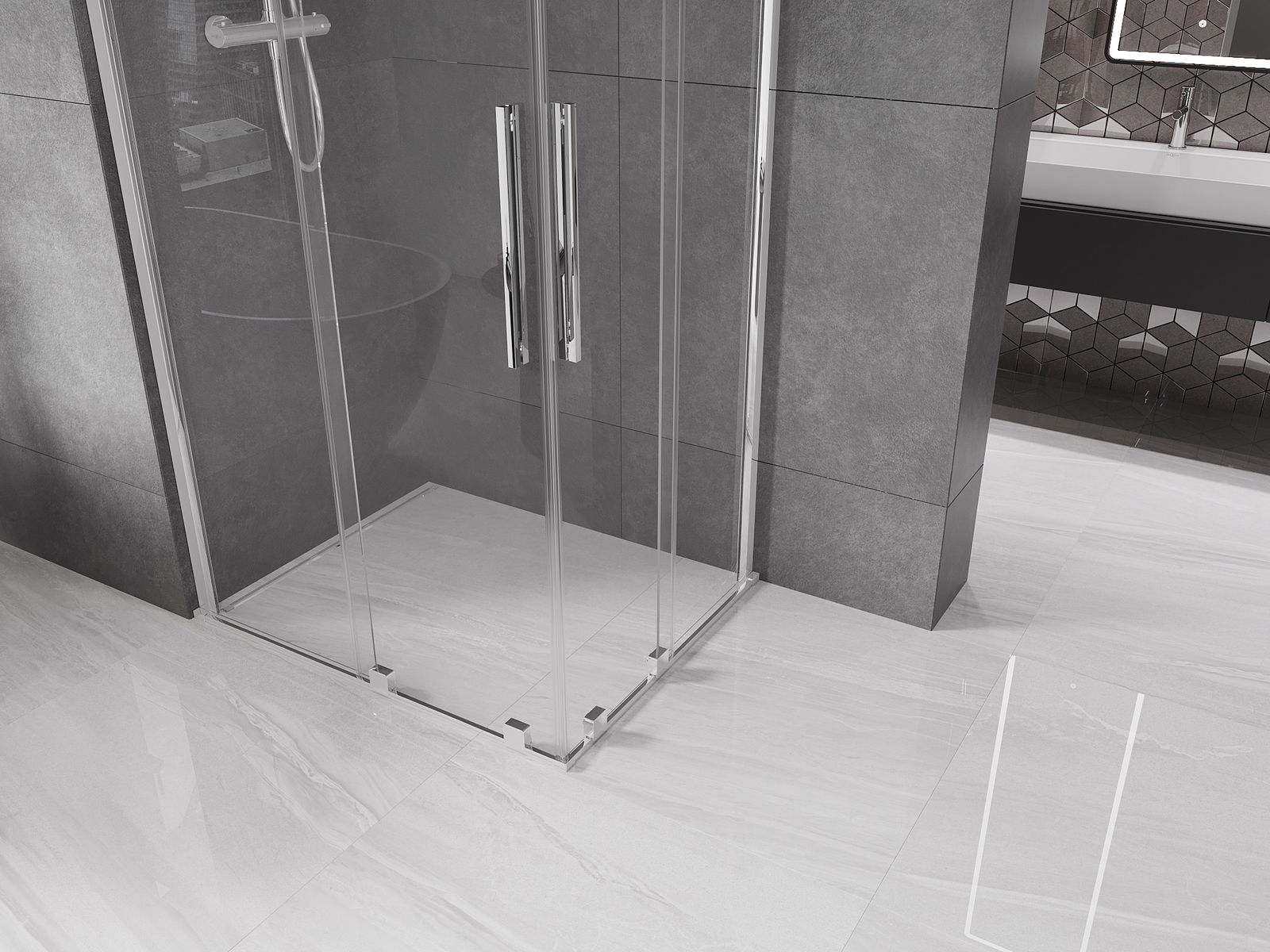 La poignée pratique et confortable est en acier inoxydable. Sa forme élégante, associée à une finition assortie à la couleur des profilés, confère à l'ensemble un style moderne et élégant, soulignant l'esthétique de chaque salle de bains.