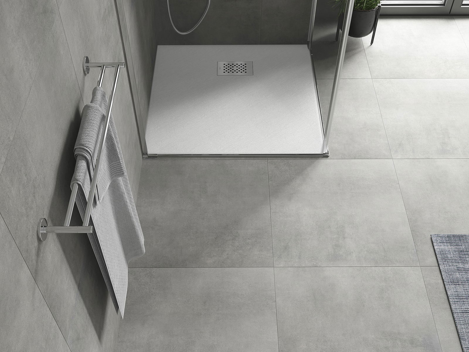 La surface du receveur de douche rappelle par sa structure la pierre. Elle constitue une combinaison exceptionnelle d'un aspect naturel et d'un aménagement intérieur moderne. Elle ajoute du caractère, souligne l'esthétique et l'élégance de la décoration de la salle de bains et séduit par sa forme.
