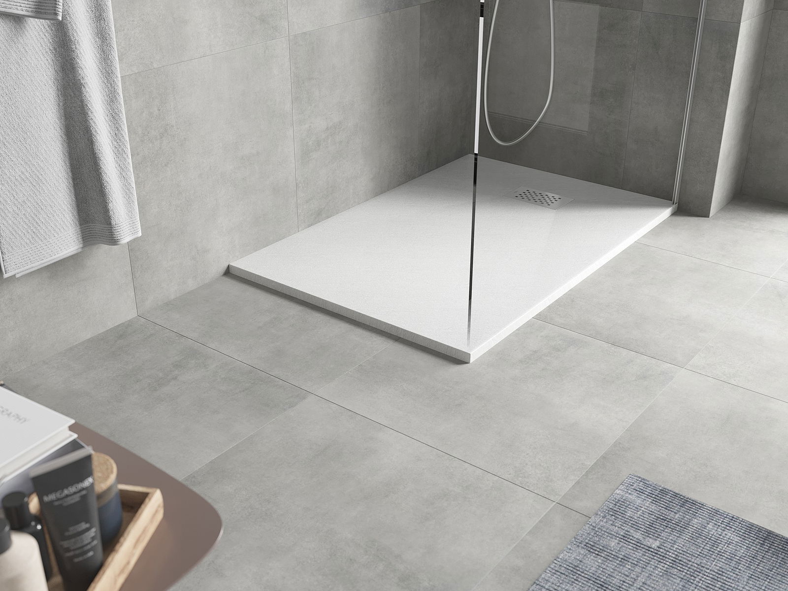 La surface du receveur de douche rappelle par sa structure la pierre. Elle constitue une combinaison exceptionnelle d'un aspect naturel et d'un aménagement intérieur moderne. Elle ajoute du caractère, souligne l'esthétique et l'élégance de la décoration de la salle de bains et séduit par sa forme.