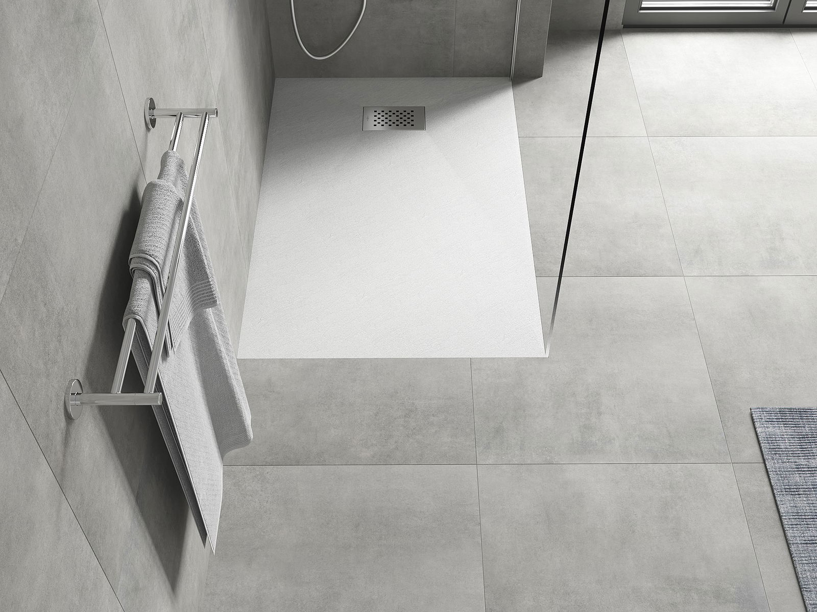 La surface du receveur de douche rappelle par sa structure la pierre. Elle constitue une combinaison exceptionnelle d'un aspect naturel et d'un aménagement intérieur moderne. Elle ajoute du caractère, souligne l'esthétique et l'élégance de la décoration de la salle de bains et séduit par sa forme.