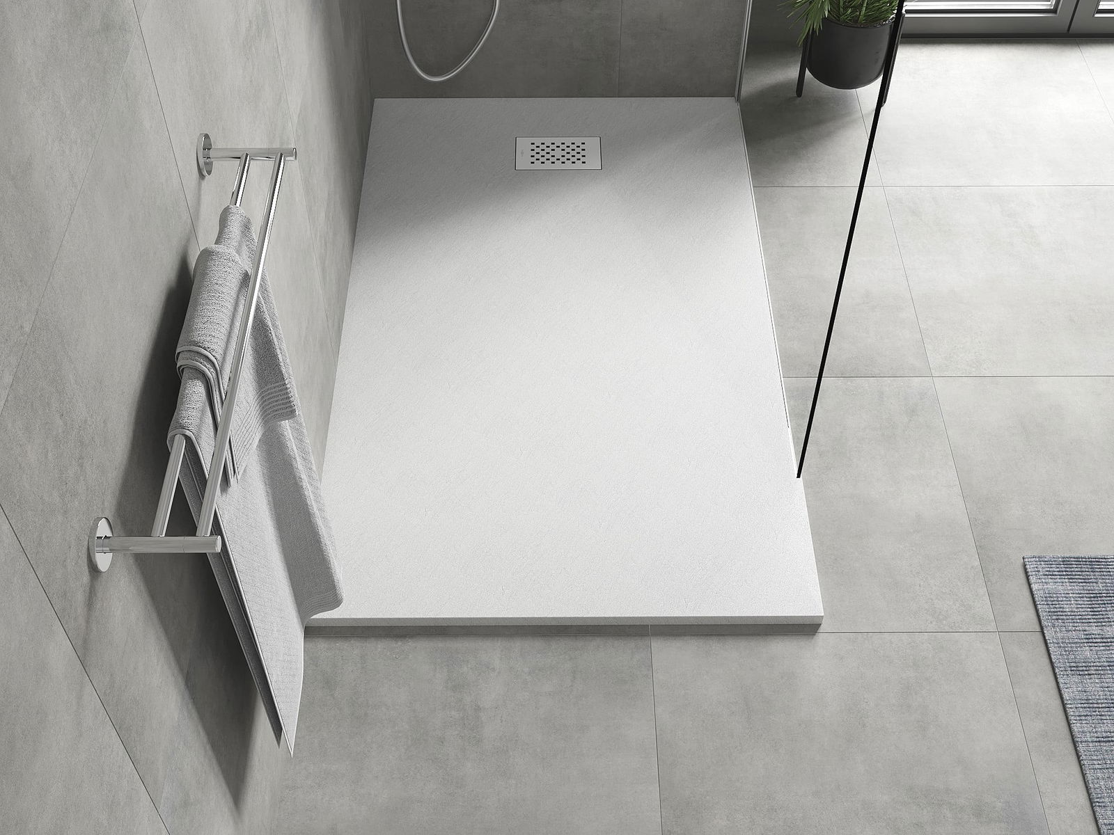 La surface du receveur de douche rappelle par sa structure la pierre. Elle constitue une combinaison exceptionnelle d'un aspect naturel et d'un aménagement intérieur moderne. Elle ajoute du caractère, souligne l'esthétique et l'élégance de la décoration de la salle de bains et séduit par sa forme.