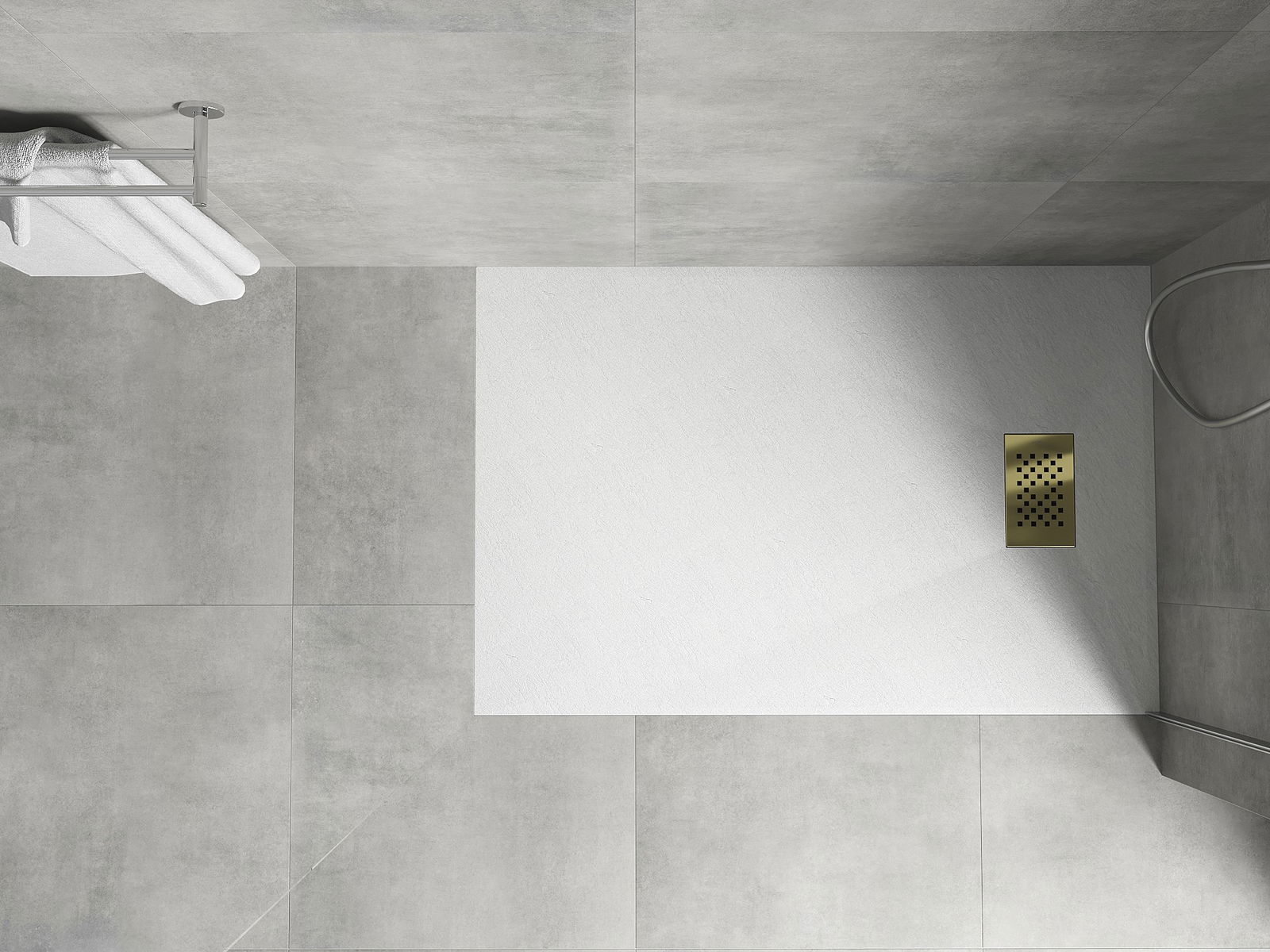 La surface du receveur de douche rappelle par sa structure la pierre. Elle constitue une combinaison exceptionnelle d'un aspect naturel et d'un aménagement intérieur moderne. Elle ajoute du caractère, souligne l'esthétique et l'élégance de la décoration de la salle de bains et séduit par sa forme.