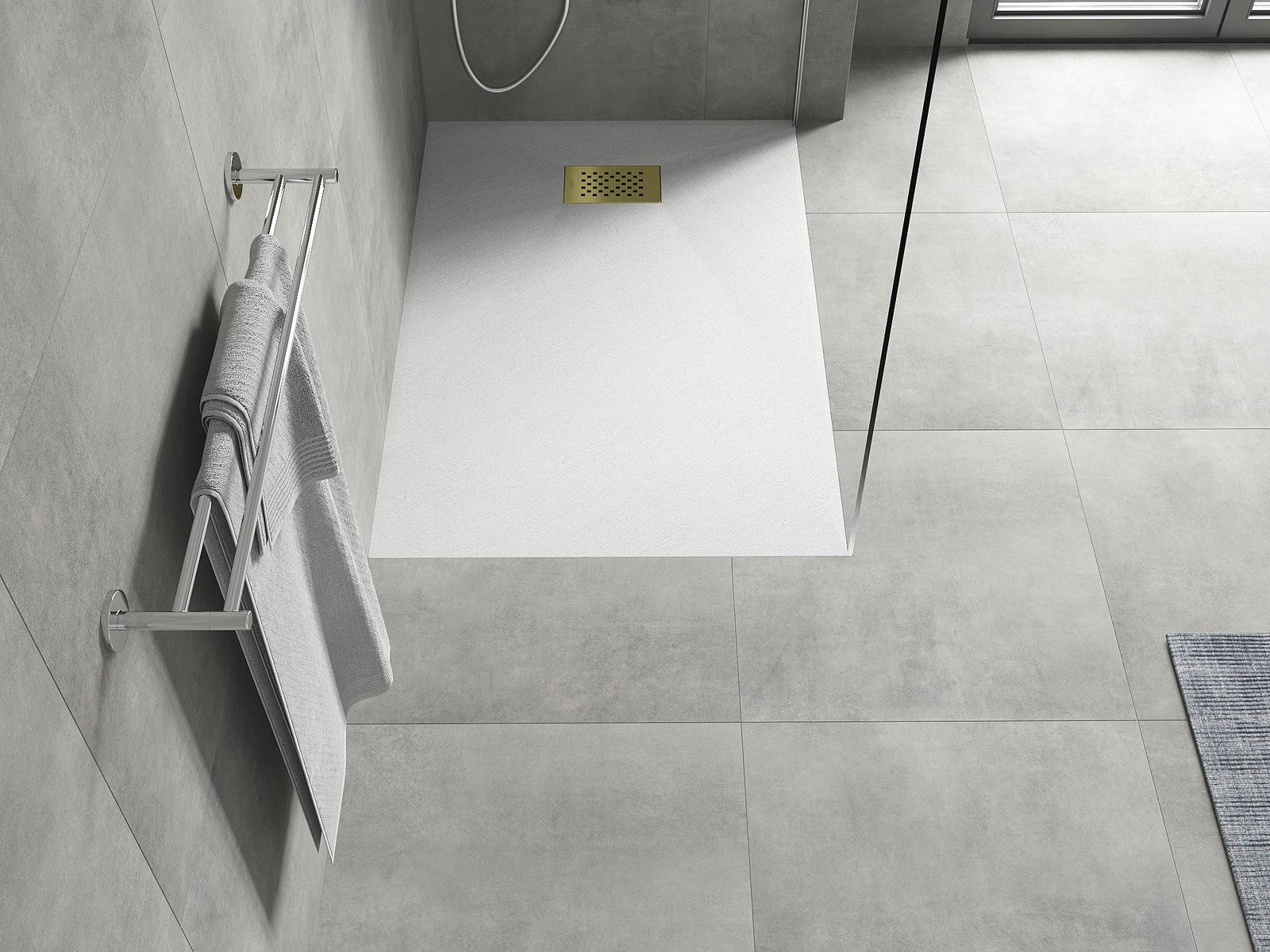 La surface du receveur de douche évoque la pierre. C'est une combinaison unique d'aspect naturel et de design intérieur moderne. Il ajoute du caractère, souligne l'esthétique et l'élégance de la salle de bains et séduit par sa forme.