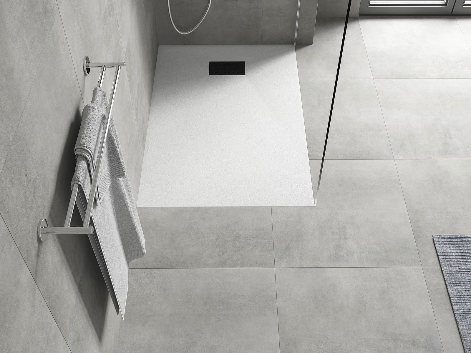 La surface du receveur de douche rappelle par sa structure la pierre. Elle constitue une combinaison exceptionnelle d'un aspect naturel et d'un aménagement intérieur moderne. Elle ajoute du caractère, souligne l'esthétique et l'élégance de la décoration de la salle de bains et séduit par sa forme.