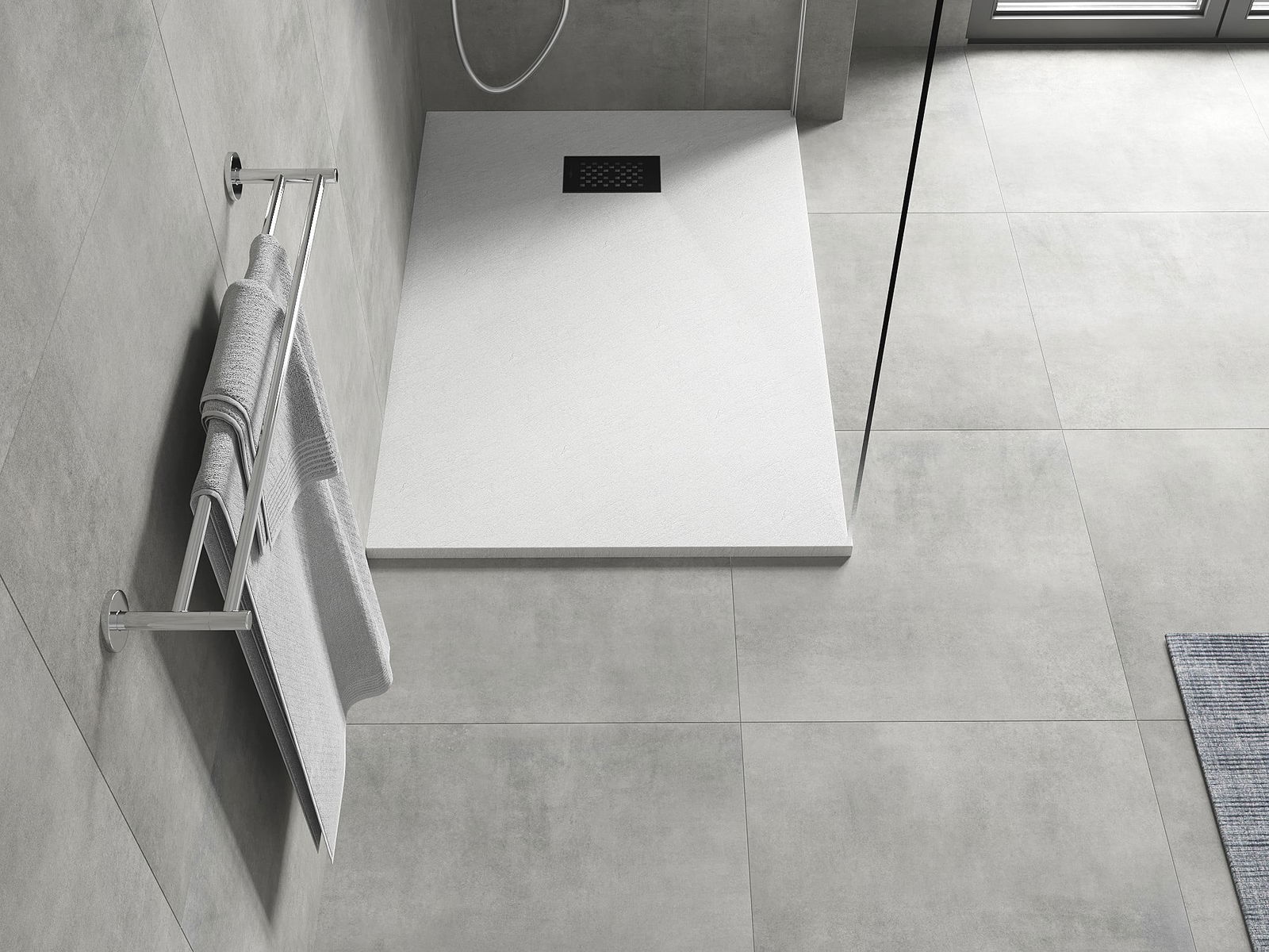La surface du receveur de douche rappelle par sa structure la pierre. Elle constitue une combinaison exceptionnelle d'un aspect naturel et d'un aménagement intérieur moderne. Elle ajoute du caractère, souligne l'esthétique et l'élégance de la décoration de la salle de bains et séduit par sa forme.
