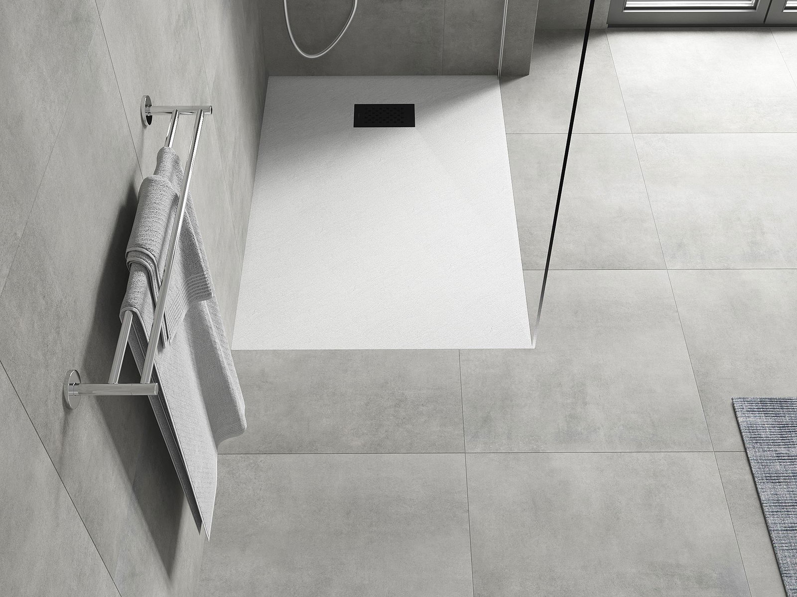 La surface du receveur de douche évoque la pierre. C'est une combinaison unique d'aspect naturel et de design intérieur moderne. Il ajoute du caractère, souligne l'esthétique et l'élégance de la salle de bains et séduit par sa forme.