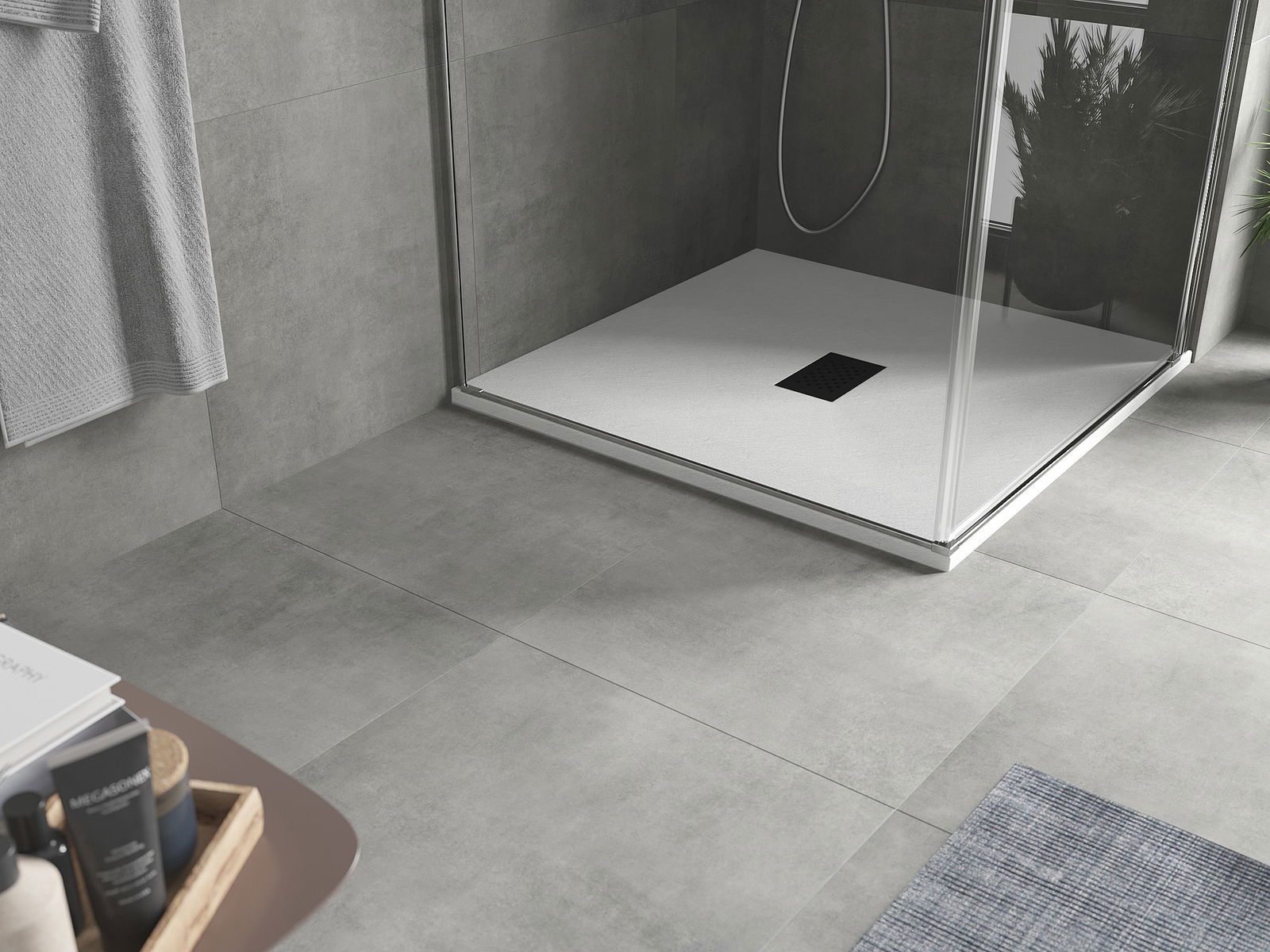 La surface du receveur de douche évoque la pierre. C'est une combinaison unique d'aspect naturel et de design intérieur moderne. Il ajoute du caractère, souligne l'esthétique et l'élégance de la salle de bains et séduit par sa forme.
