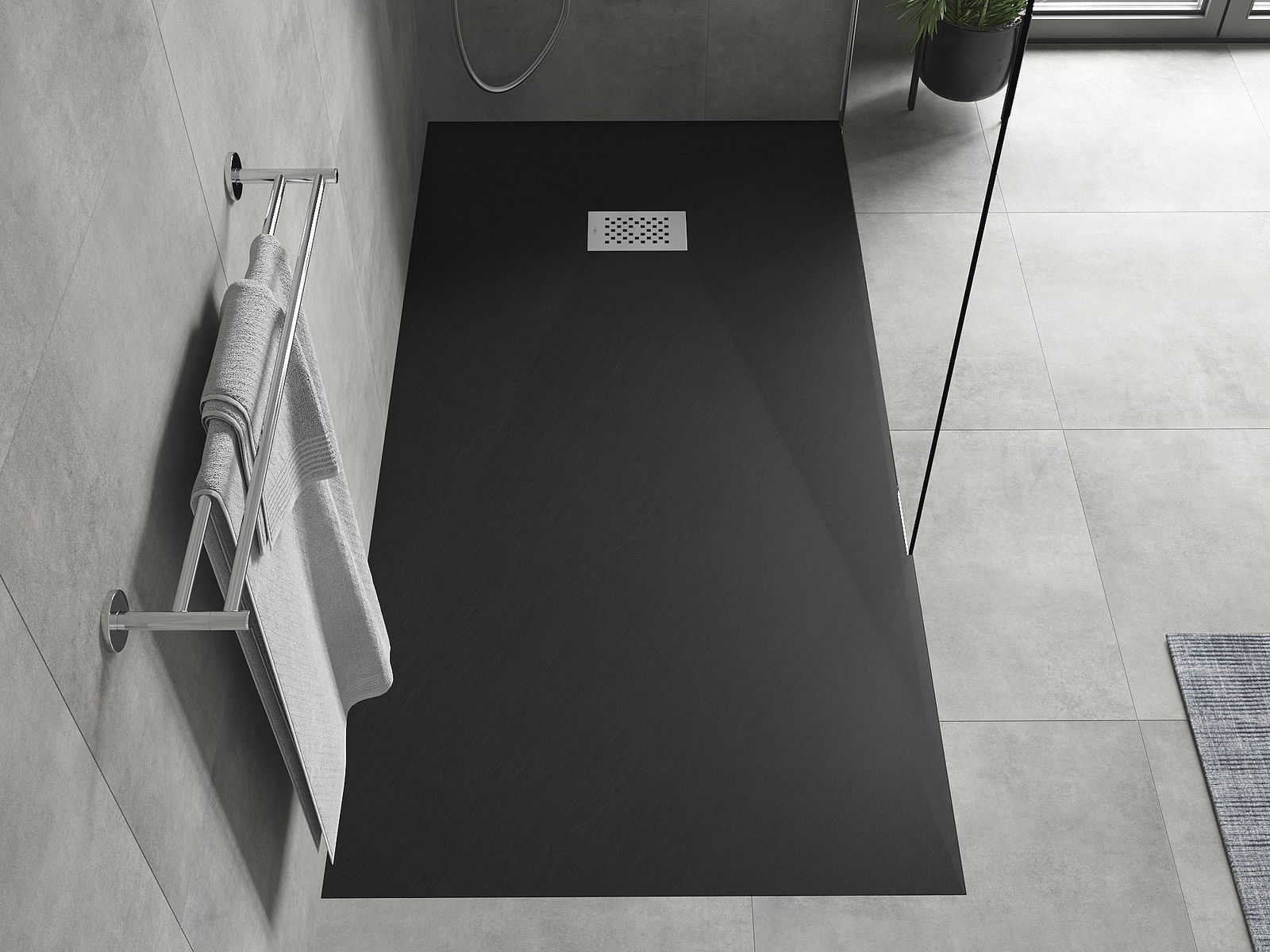 La surface du receveur de douche évoque la pierre. C'est une combinaison unique d'aspect naturel et de design intérieur moderne. Il ajoute du caractère, souligne l'esthétique et l'élégance de la salle de bains et séduit par sa forme.