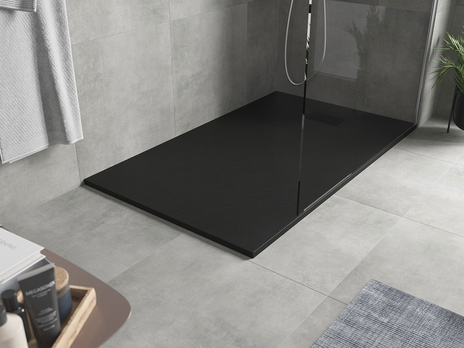 La surface du receveur de douche évoque la pierre. C'est une combinaison unique d'aspect naturel et de design intérieur moderne. Il ajoute du caractère, souligne l'esthétique et l'élégance de la salle de bains et séduit par sa forme.