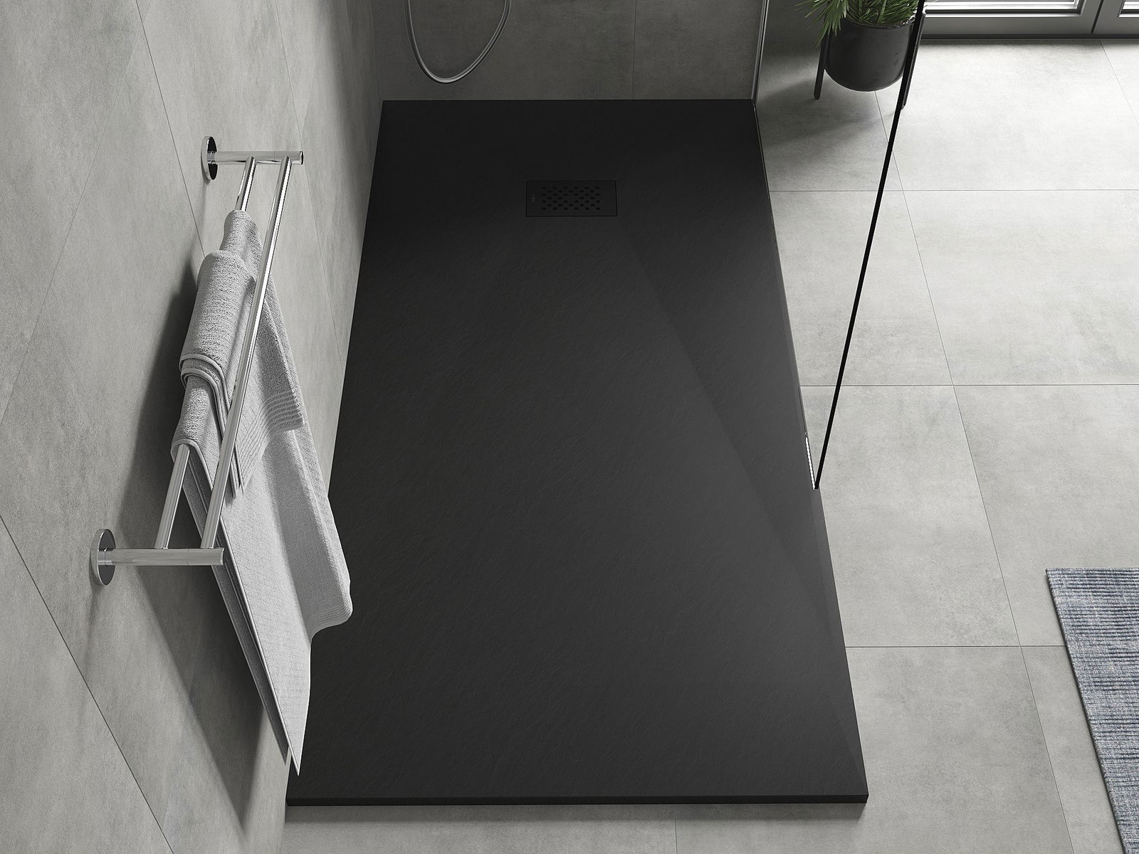 La surface du receveur de douche évoque la pierre. C'est une combinaison unique d'aspect naturel et de design intérieur moderne. Il ajoute du caractère, souligne l'esthétique et l'élégance de la salle de bains et séduit par sa forme.