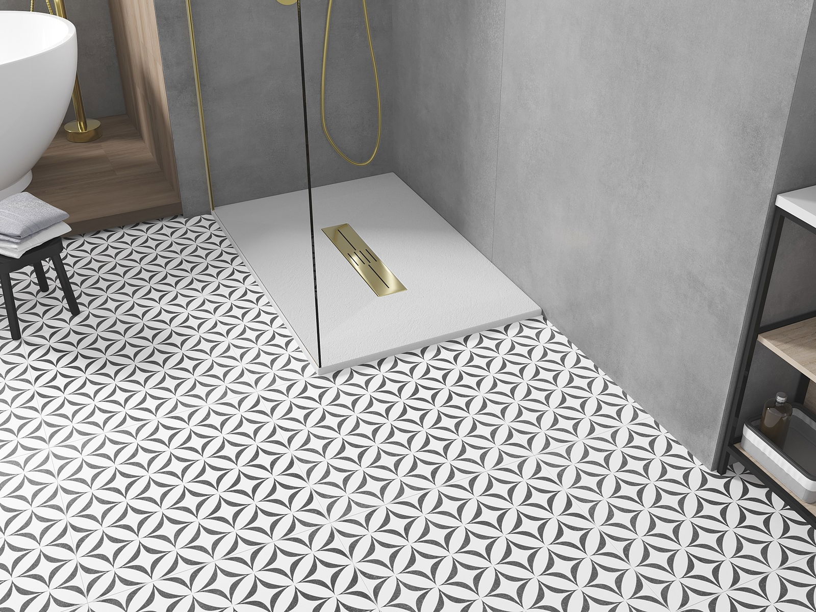La surface du receveur de douche rappelle par sa structure la pierre. Elle constitue une combinaison exceptionnelle d'un aspect naturel et d'un aménagement intérieur moderne. Elle ajoute du caractère, souligne l'esthétique et l'élégance de la décoration de la salle de bains et séduit par sa forme.