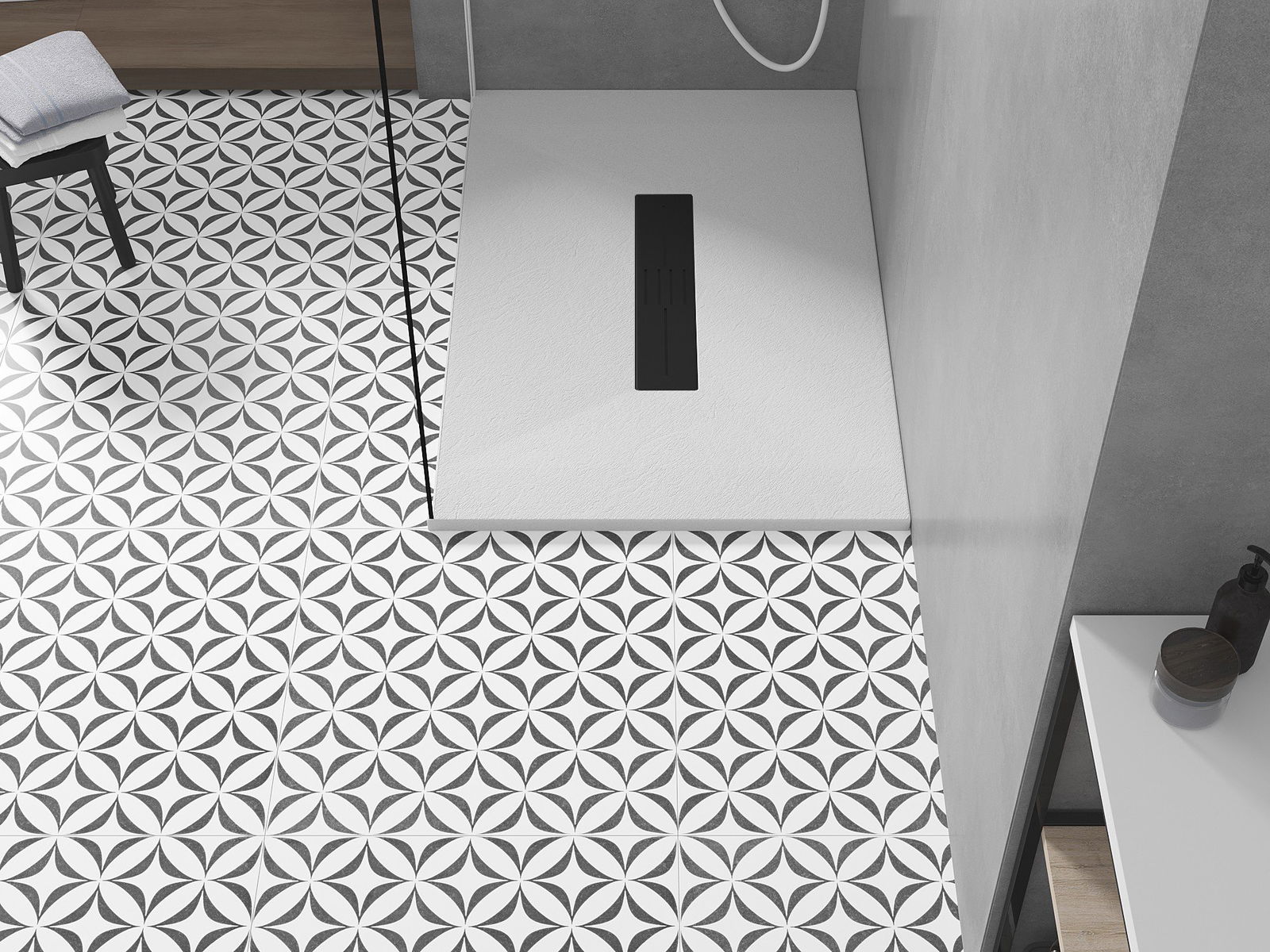 La surface du receveur de douche évoque la pierre. C'est une combinaison unique d'aspect naturel et de design intérieur moderne. Il ajoute du caractère, souligne l'esthétique et l'élégance de la salle de bains et séduit par sa forme.