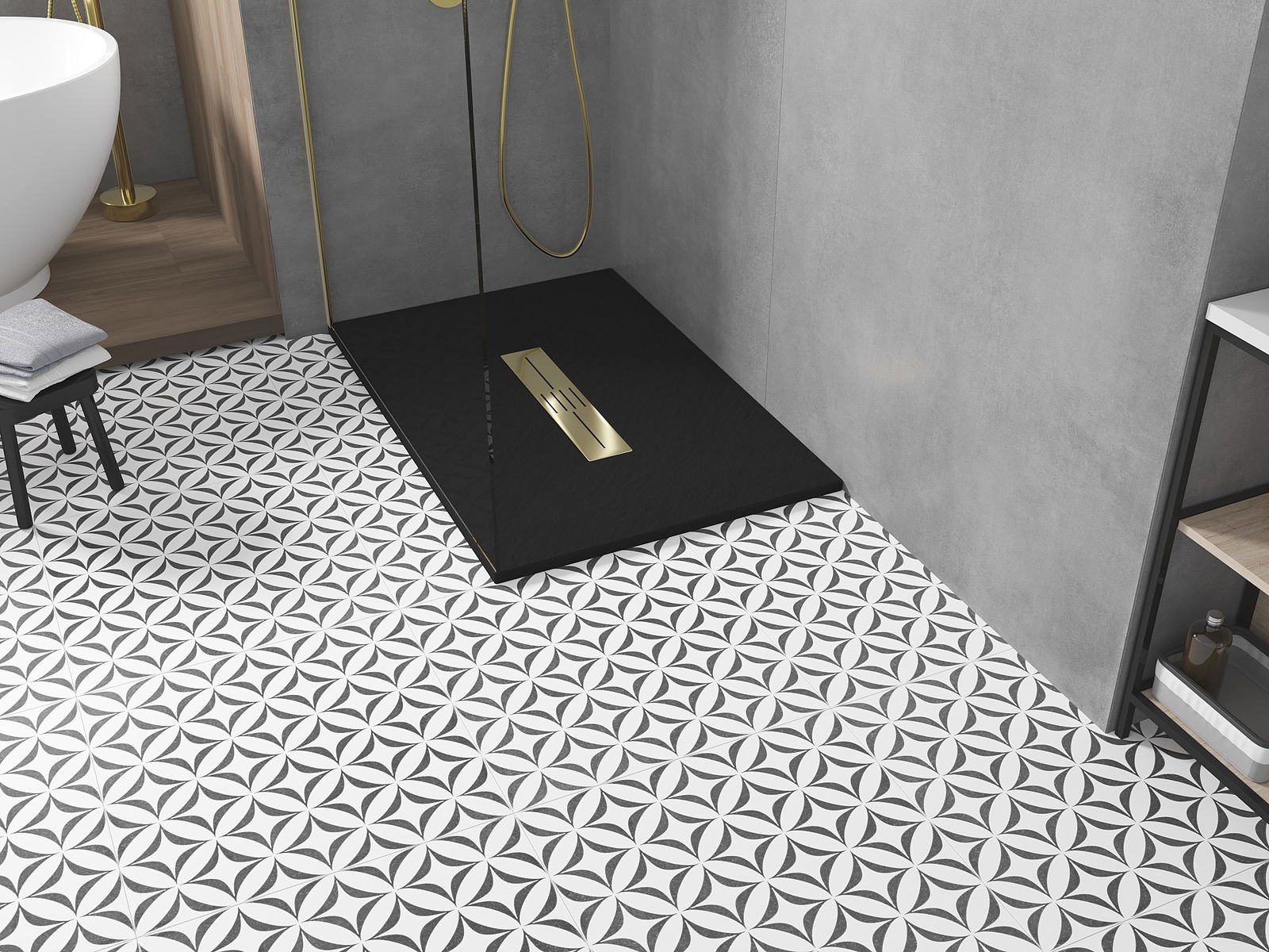 La surface du receveur de douche rappelle par sa structure la pierre. Elle constitue une combinaison exceptionnelle d'un aspect naturel et d'un aménagement intérieur moderne. Elle ajoute du caractère, souligne l'esthétique et l'élégance de la décoration de la salle de bains et séduit par sa forme.