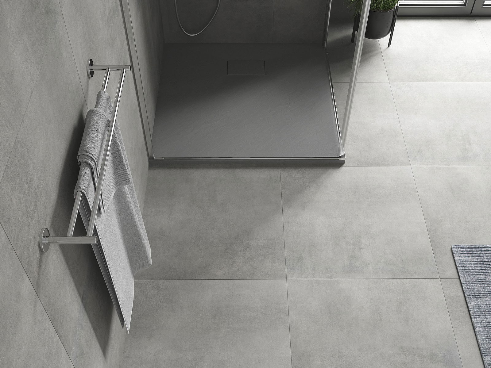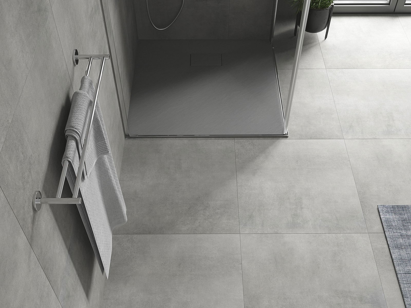La surface du receveur de douche évoque la pierre. C'est une combinaison unique d'aspect naturel et de design intérieur moderne. Il ajoute du caractère, souligne l'esthétique et l'élégance de la salle de bains et séduit par sa forme.
