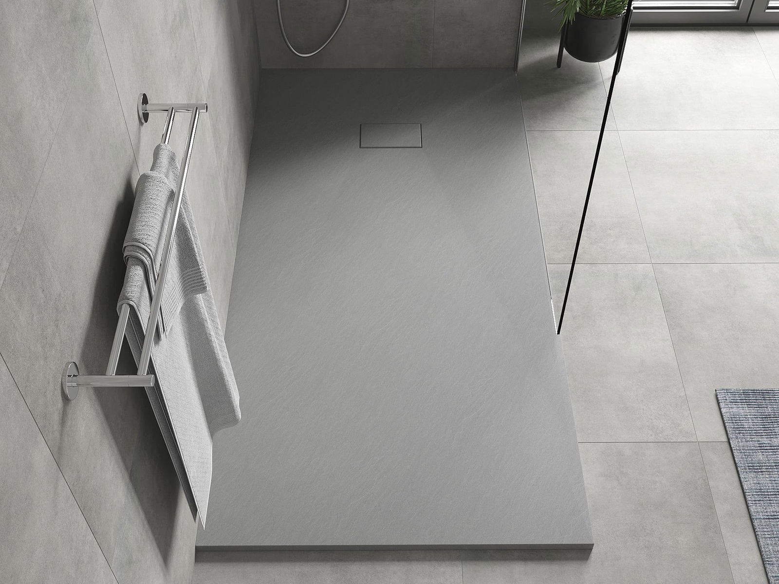 La surface du receveur de douche rappelle par sa structure la pierre. Elle constitue une combinaison exceptionnelle d'un aspect naturel et d'un aménagement intérieur moderne. Elle ajoute du caractère, souligne l'esthétique et l'élégance de la décoration de la salle de bains et séduit par sa forme.