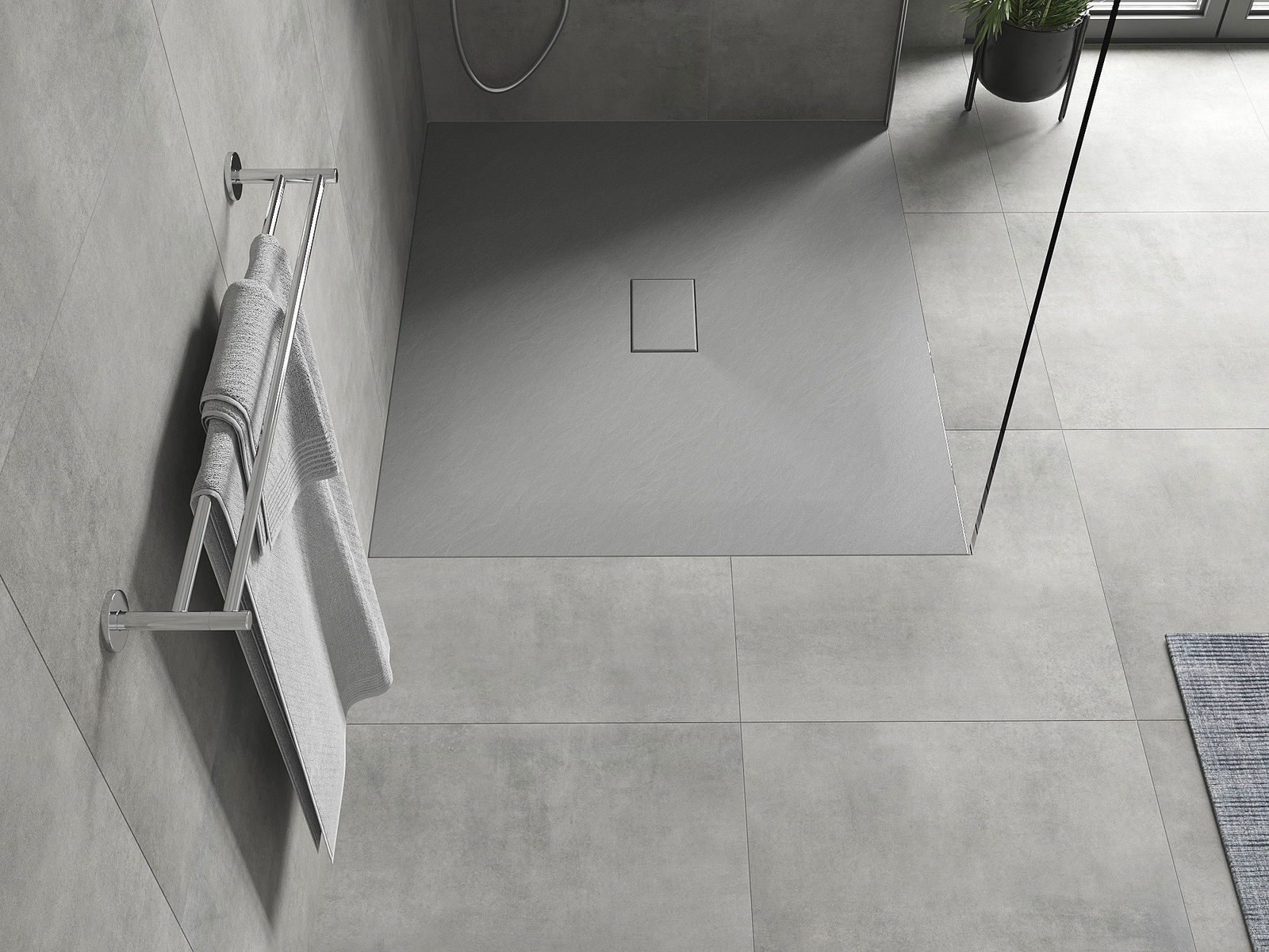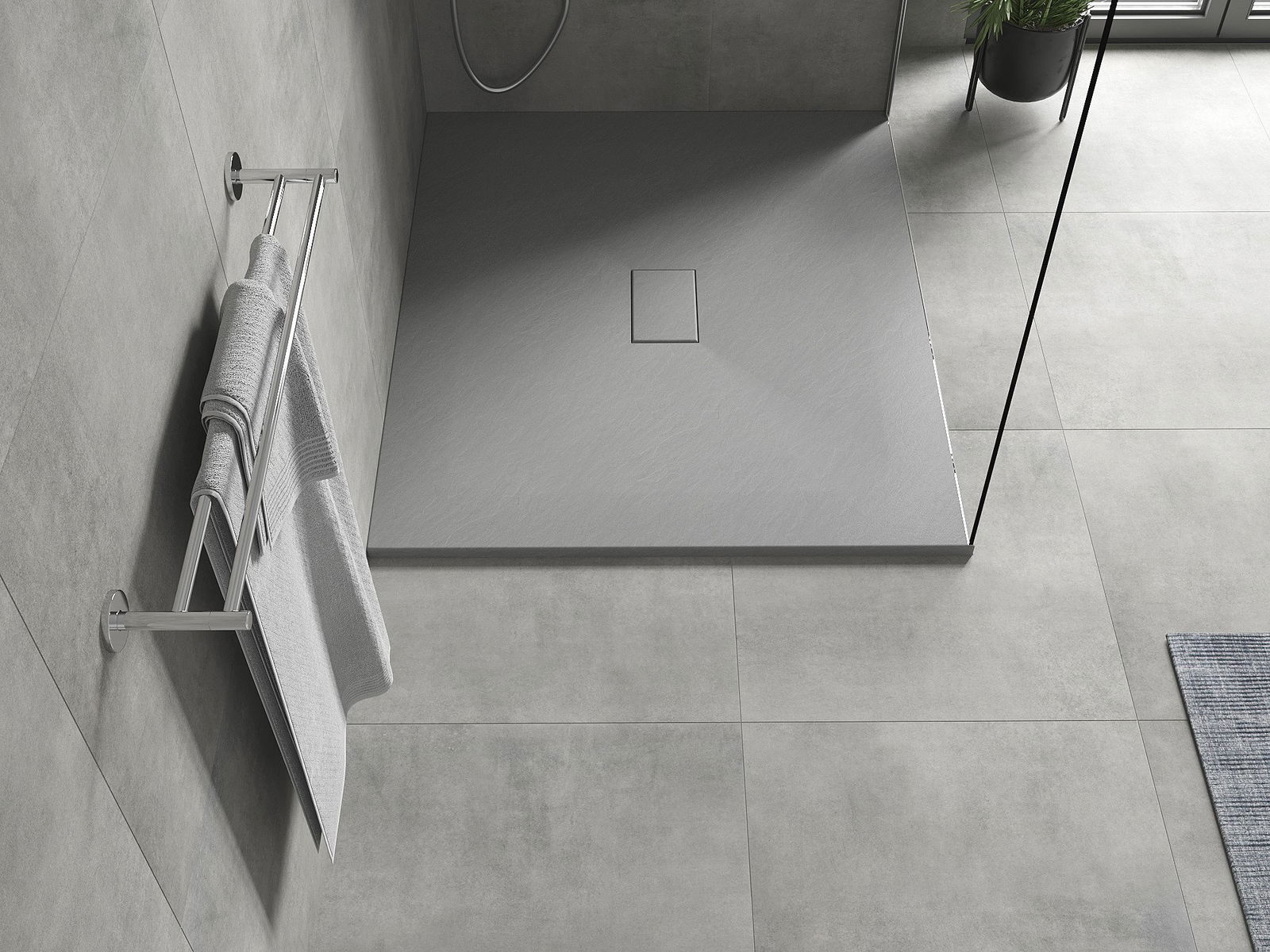 La surface du receveur de douche évoque la pierre. C'est une combinaison unique d'aspect naturel et de design intérieur moderne. Il ajoute du caractère, souligne l'esthétique et l'élégance de la salle de bains et séduit par sa forme.