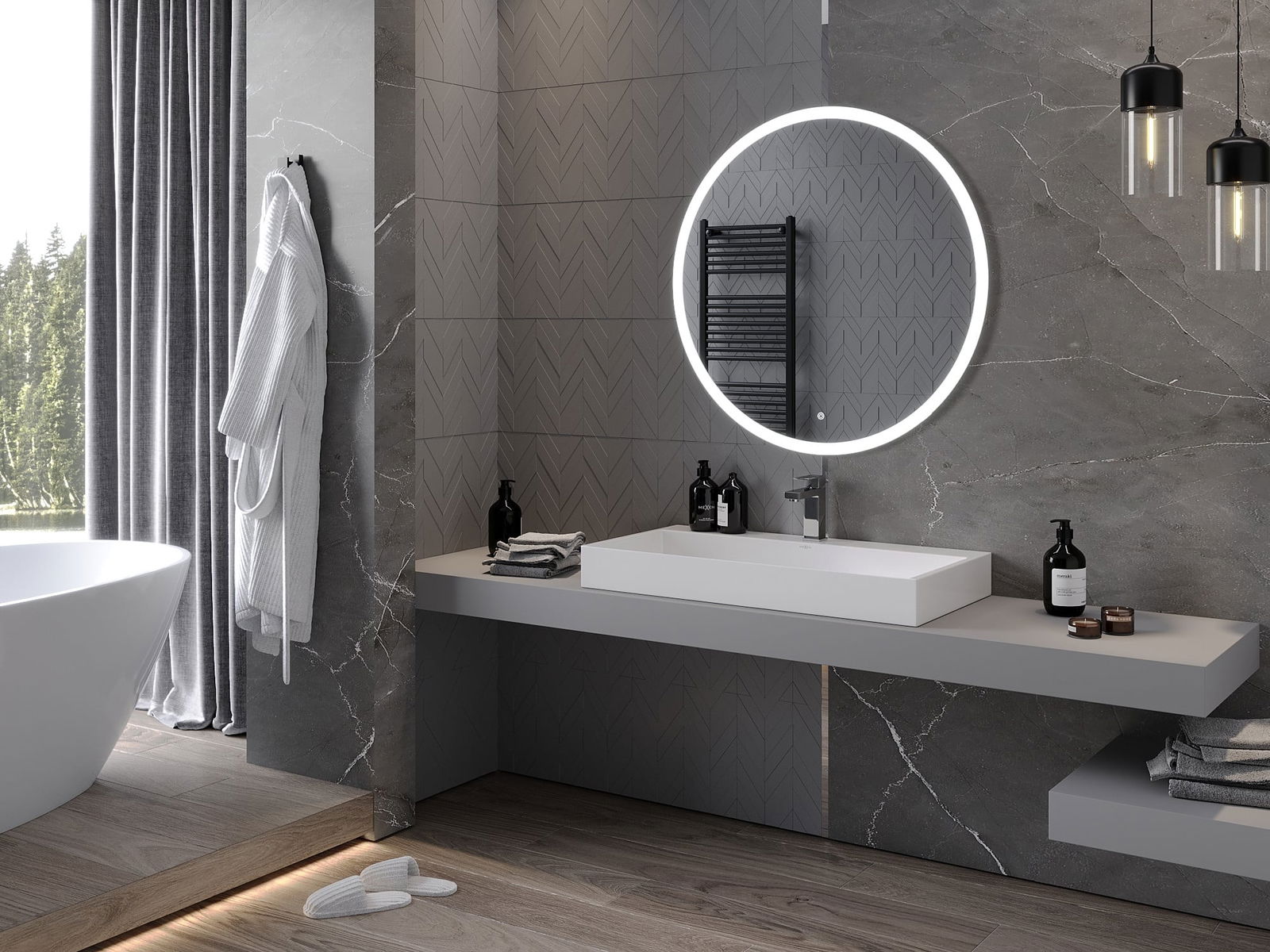 L'éclairage LED autour du miroir est un élément pratique qui facilite les soins quotidiens en offrant la possibilité d'éclairer parfaitement le visage. L'éclairage donne à la salle de bain une finition moderne, soulignant son décor élégant.
