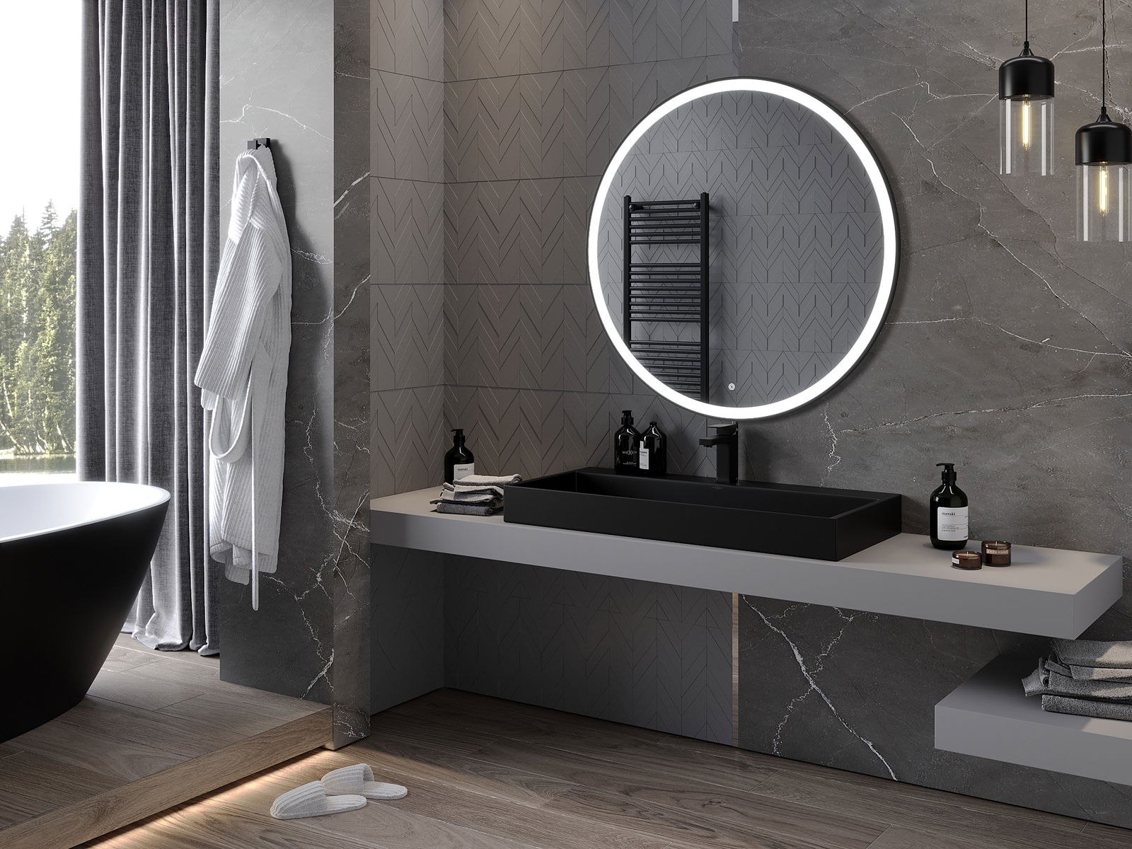 L'éclairage LED autour du miroir est un élément pratique qui facilite les soins quotidiens en offrant la possibilité d'éclairer parfaitement le visage. L'éclairage donne à la salle de bain une finition moderne, soulignant son décor élégant.
