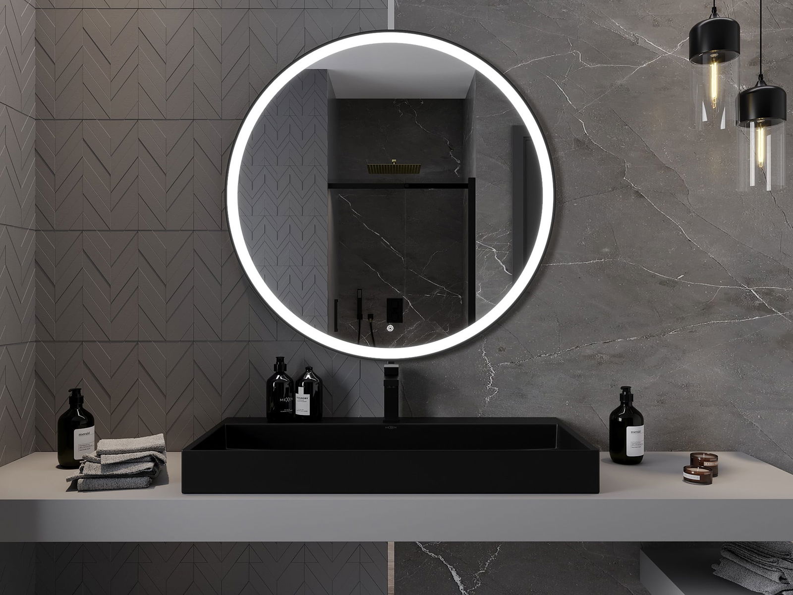 Mexen Esso miroir de salle de bain éclairé, rond 100 cm, LED 6000K, antibuée, cadre noir - 9825-100-100-611-70