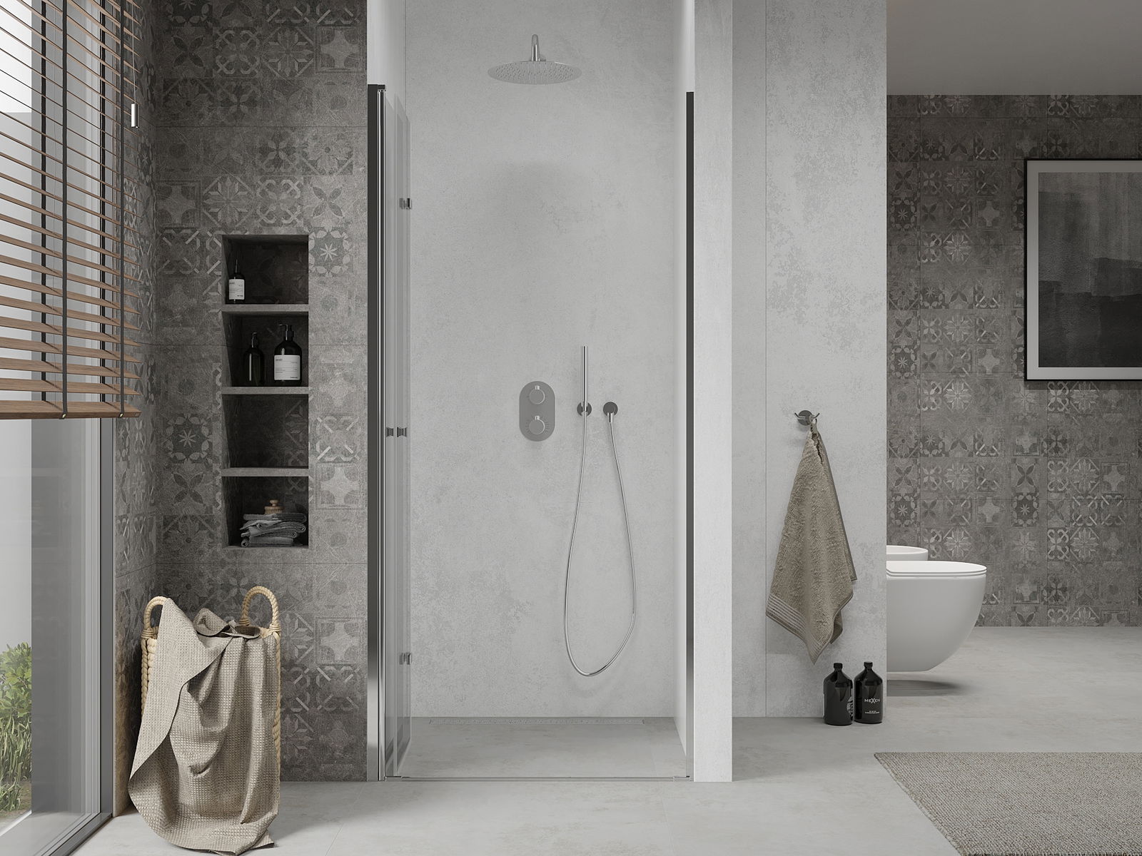 La poignée pratique et confortable est fabriquée en métal durable et résistant. Sa forme à la mode, combinée à une finition assortie à la couleur des profilés, donne à l'ensemble un aspect moderne et stylé, soulignant l'esthétique de chaque salle de bain.