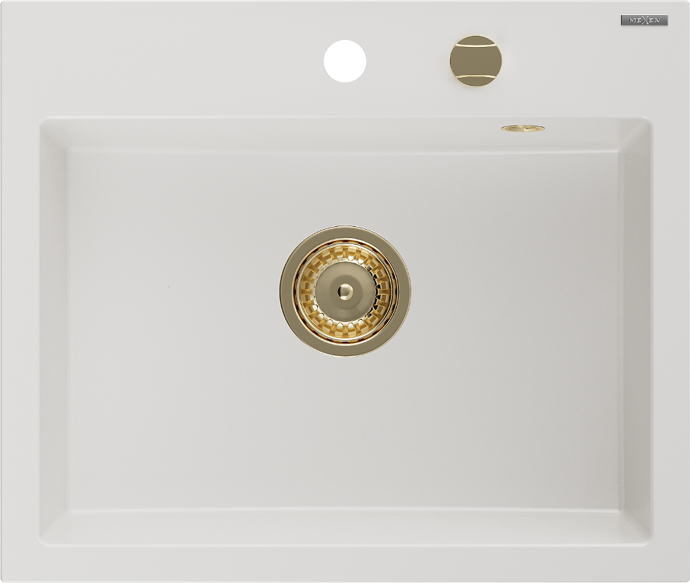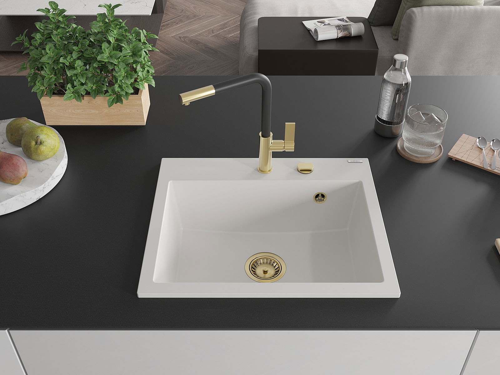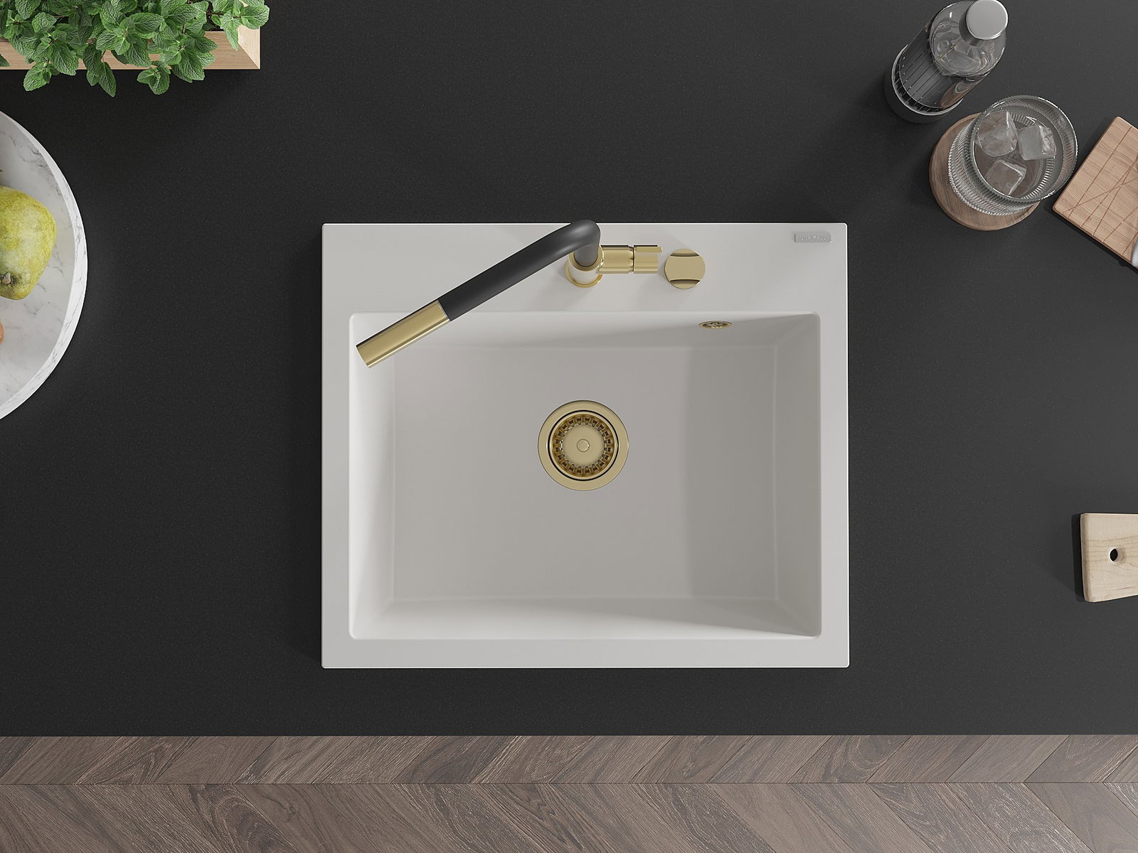 Mexen Oscar évier de cuisine en granit 1 bac 580 x 490 mm, blanc, siphon doré - 6519581000-20-G