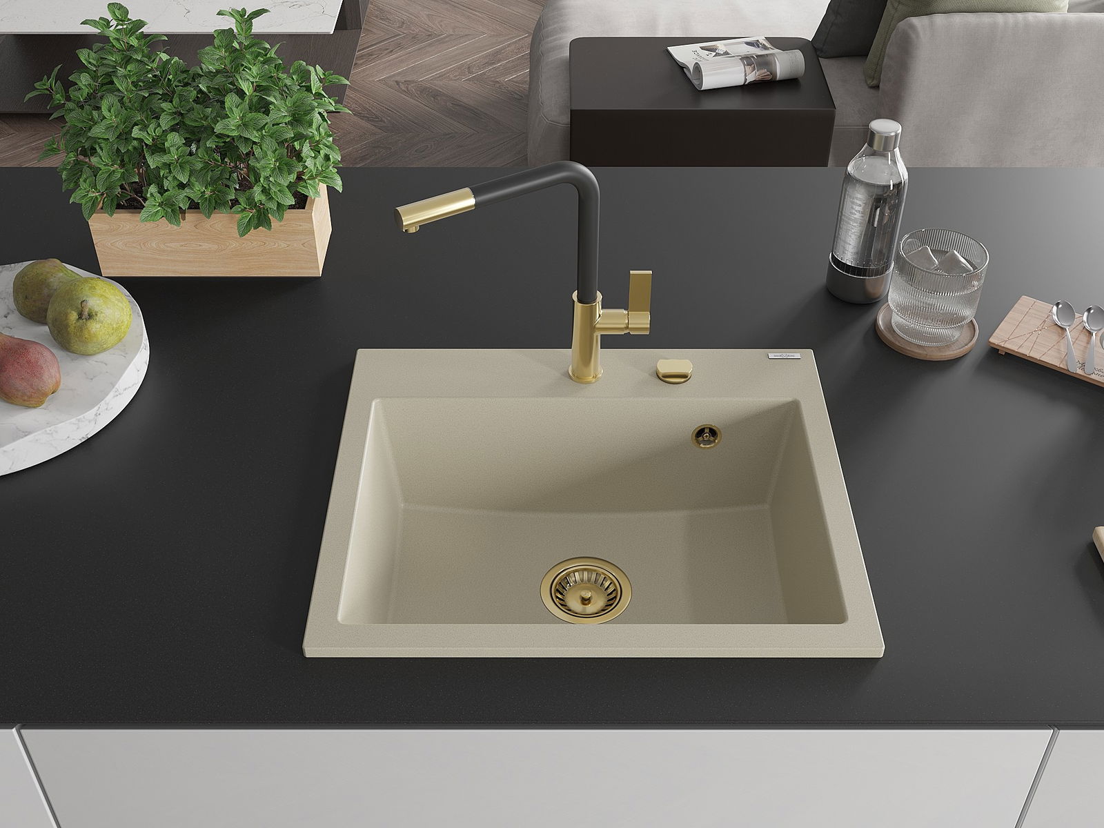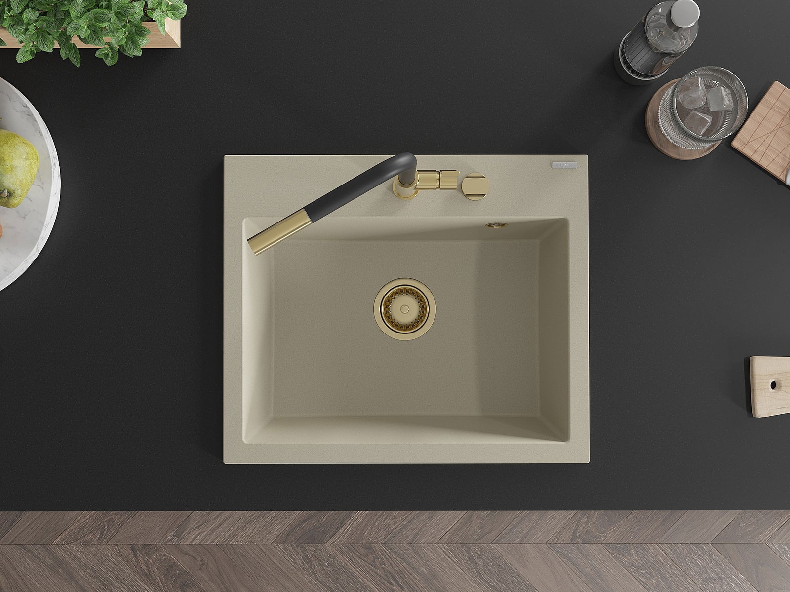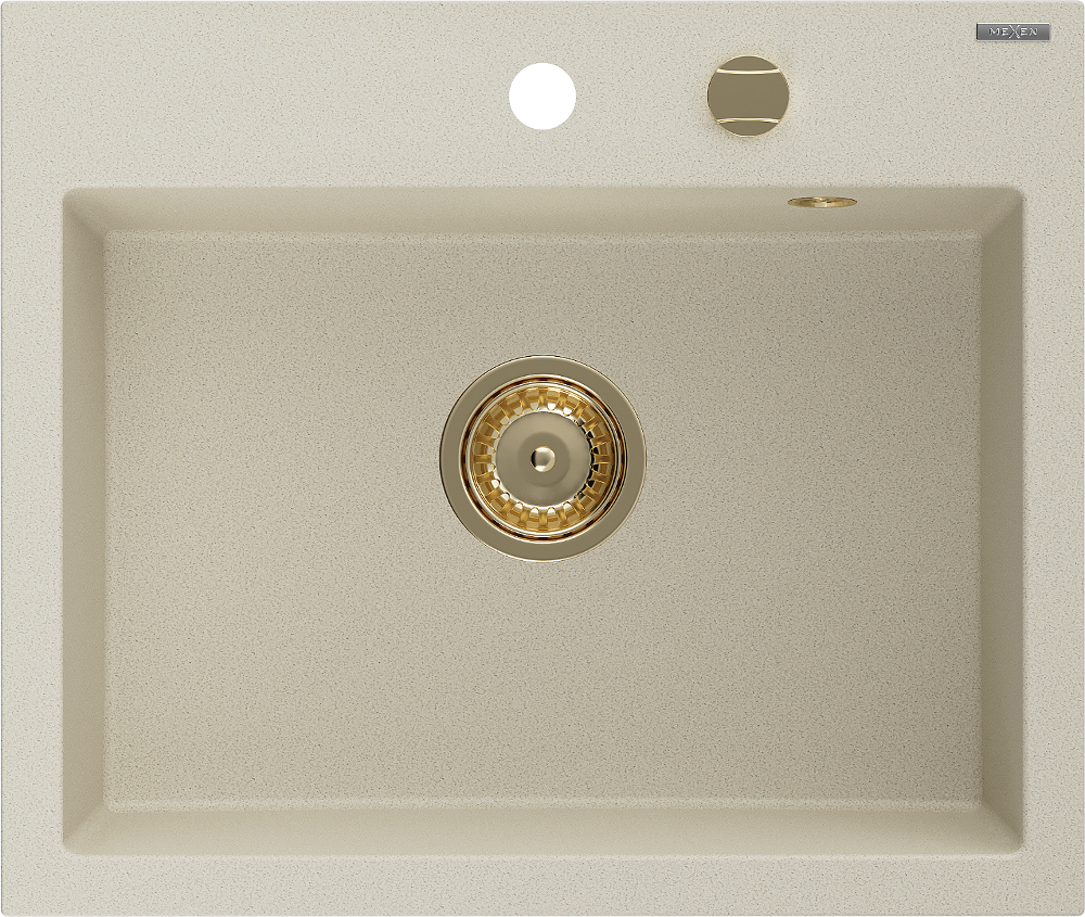 Mexen Oscar évier en granit 1 bac 580 x 490 mm, beige, siphon doré - 6519581000-69-G