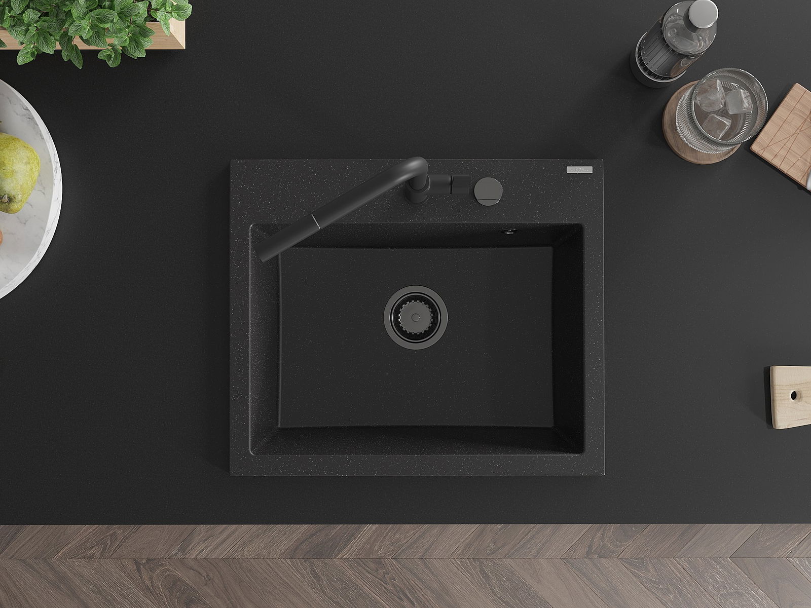 Mexen Oscar évier en granit 1 bac 580 x 490 mm, noir/métallique argent, siphon noir - 6519581000-73-B
