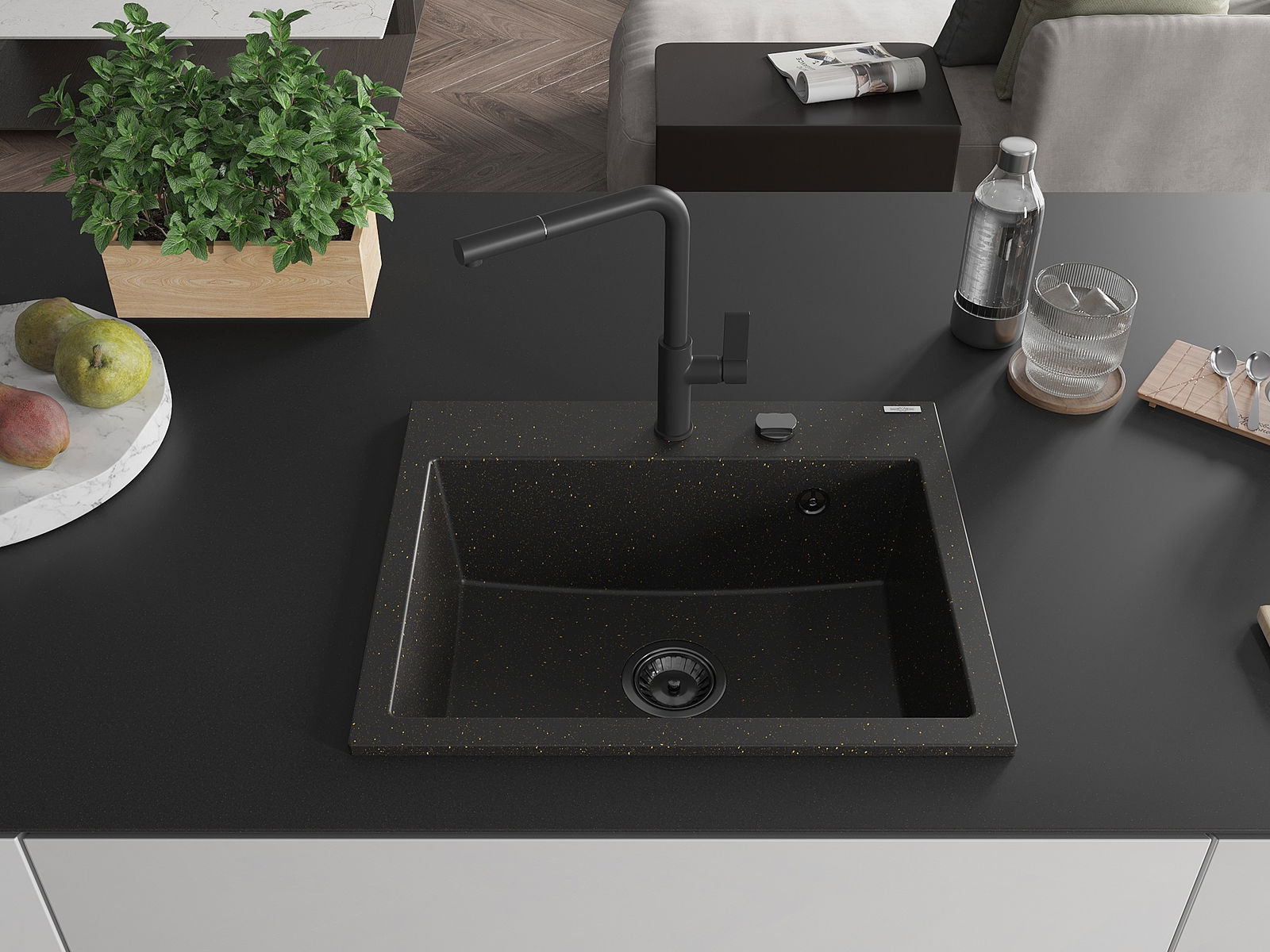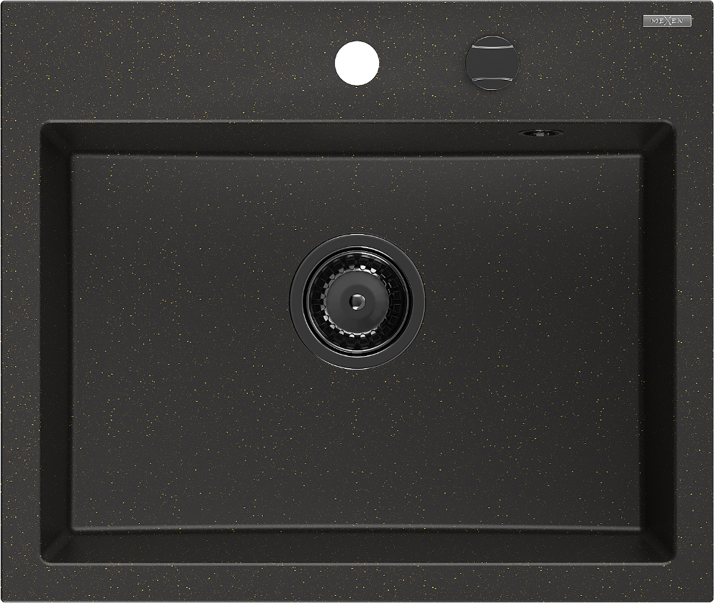 Mexen Oscar évier en granit à 1 bac 580 x 490 mm, noir/doré métallisé, siphon noir - 6519581000-75-B