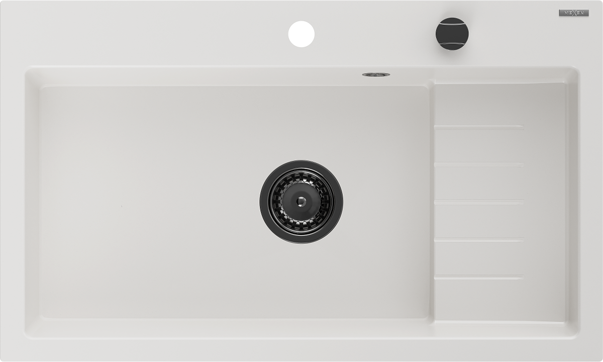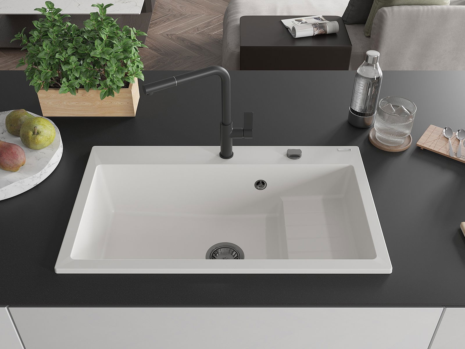 Mexen Omar évier en granit 1 bac 800 x 480 mm, blanc, siphon noir - 6520801005-20-B