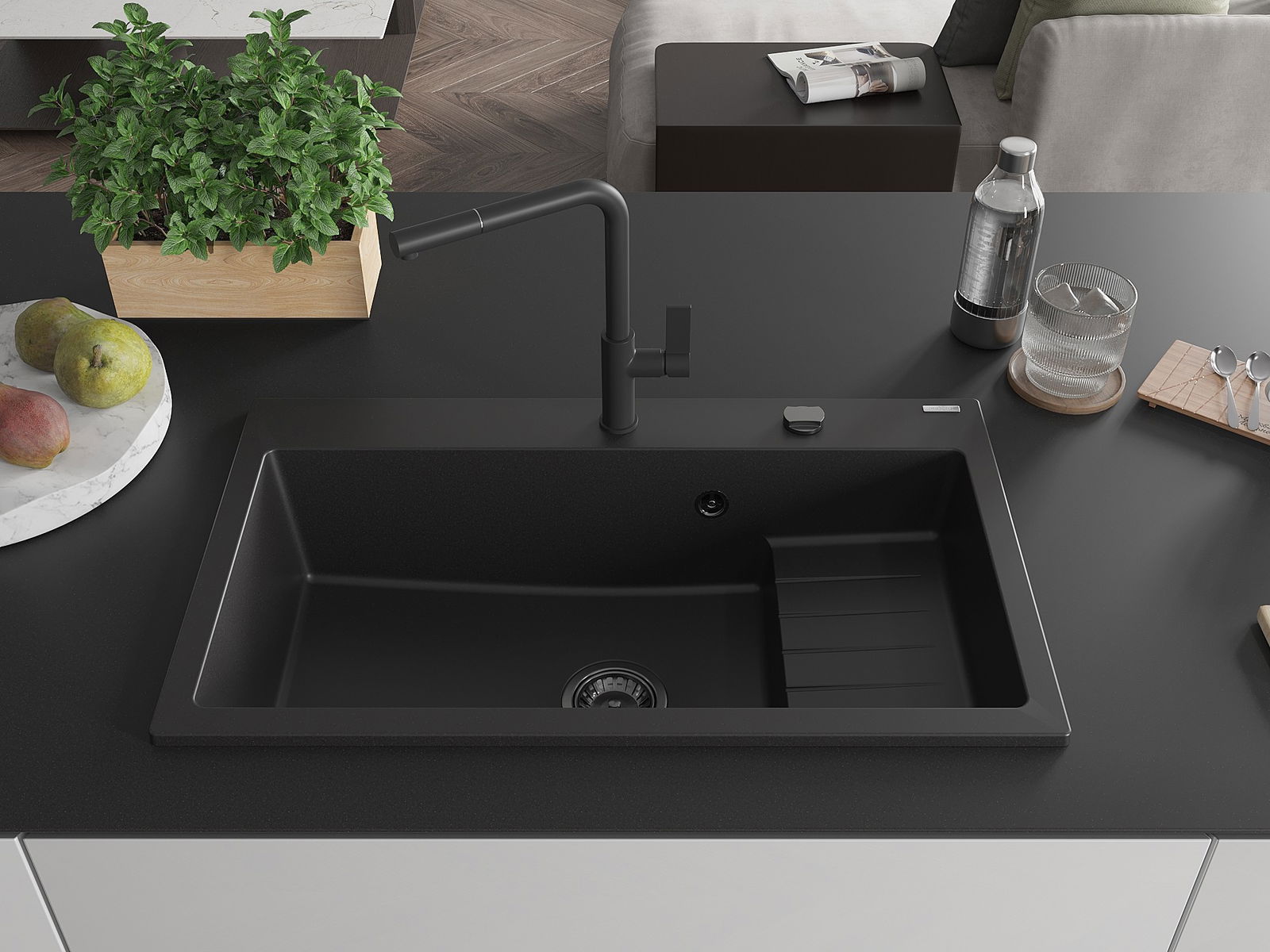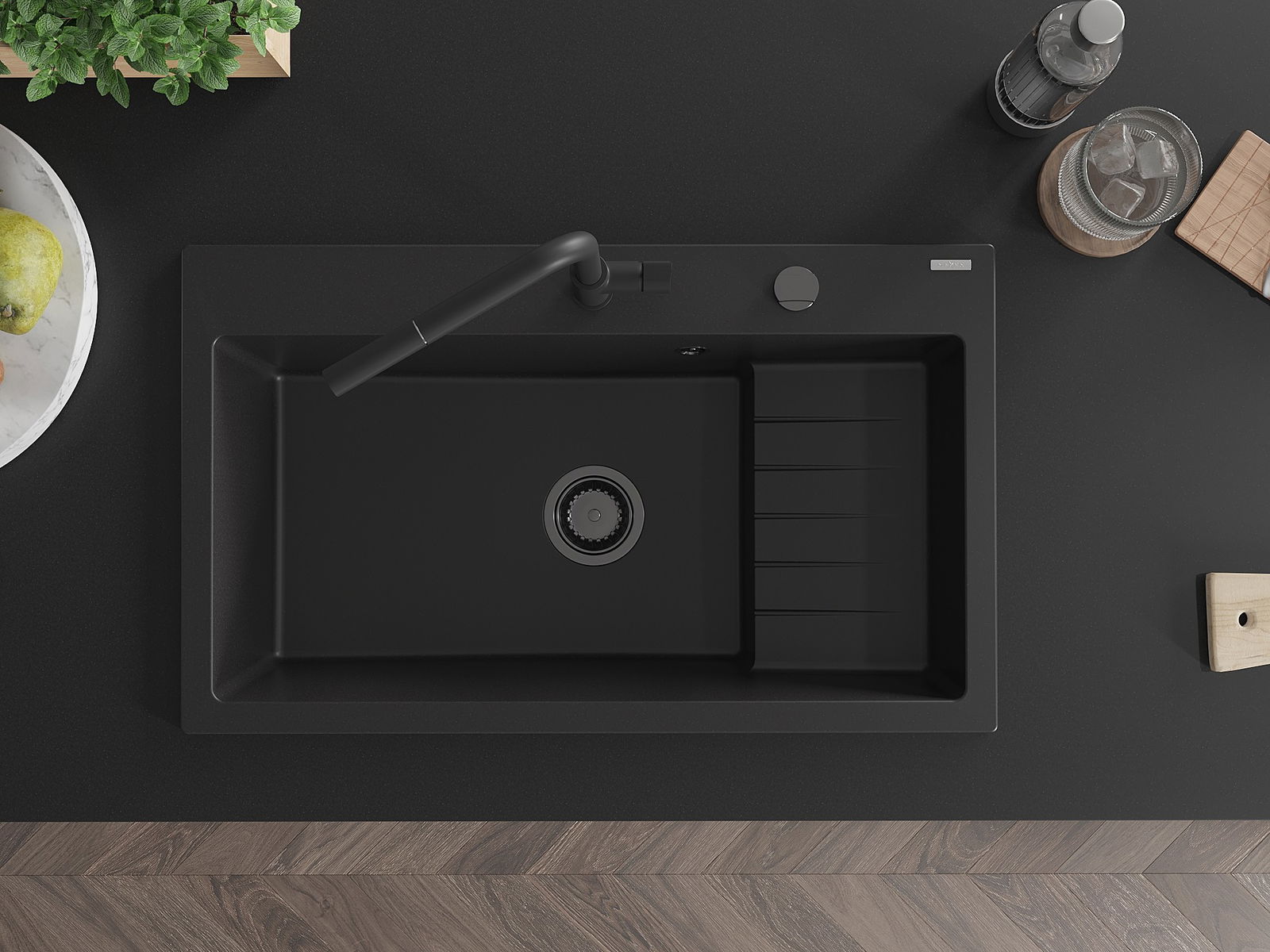 Mexen Omar évier en granit 1 bac 800 x 480 mm, noir, siphon noir - 6520801005-77-B