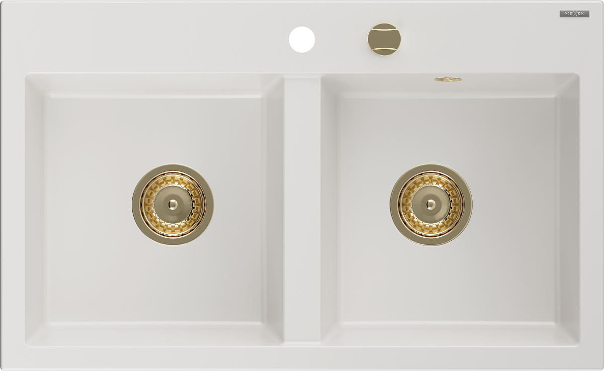 Mexen Hektor évier en granit 2 bacs 800 x 480 mm, blanc, siphon doré - 6521802000-20-G