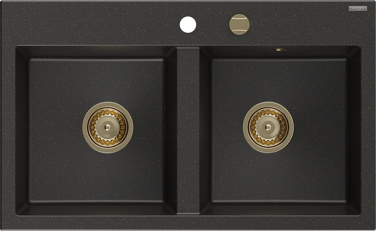 Mexen Hektor évier en granit à 2 bacs 800 x 480 mm, noir/doré métallisé, siphon doré - 6521802000-75-G