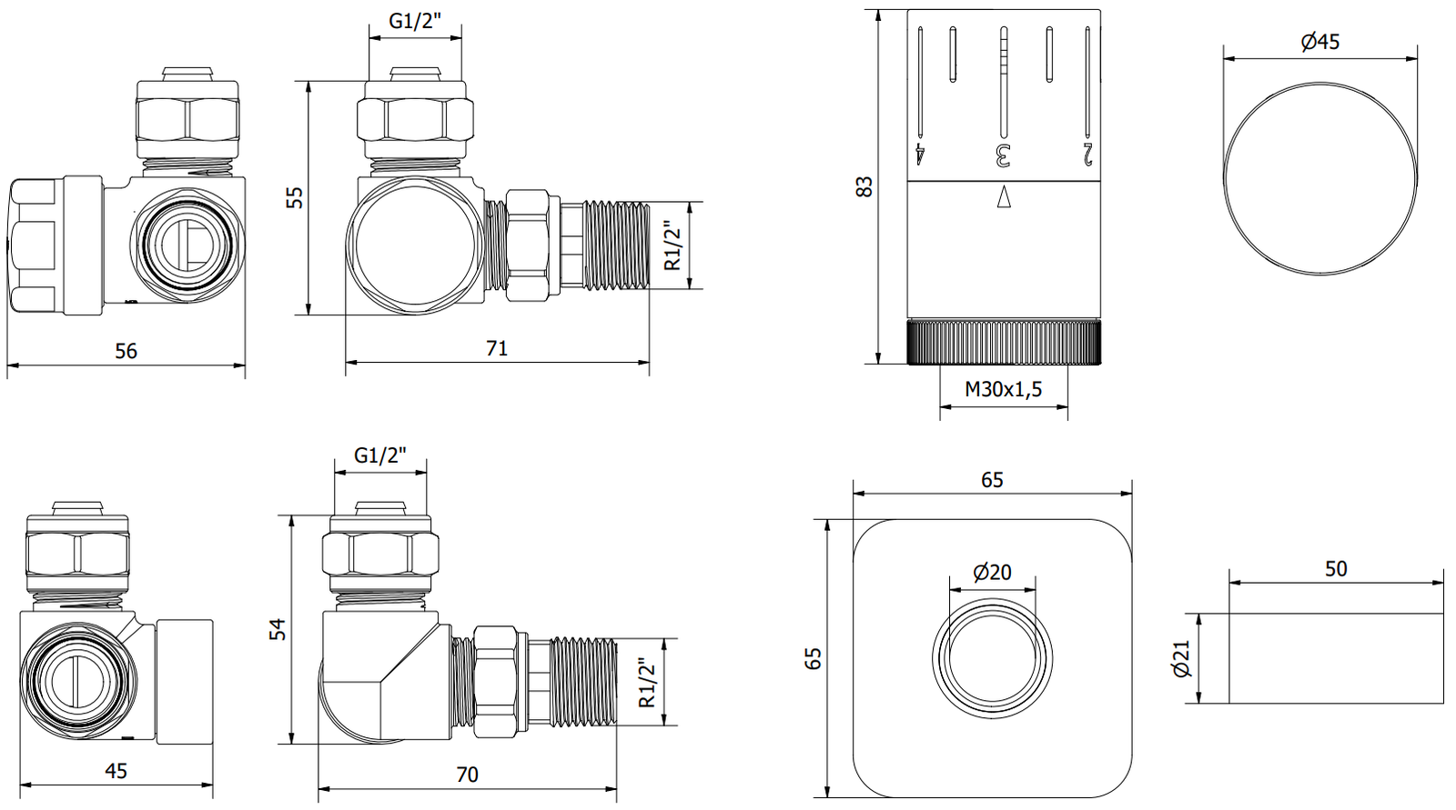 Ensemble complet avec vanne de radiateur d'alimentation et vanne d'arrêt