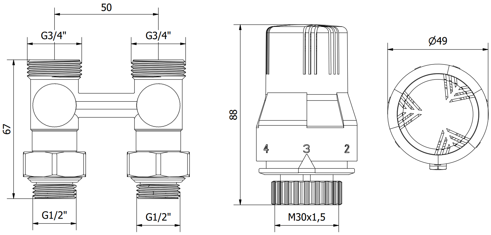 Mexen G02 ensemble thermostatique à deux tuyaux DN50, droit 1/2"x3/4", nickel - W912-012-928-01