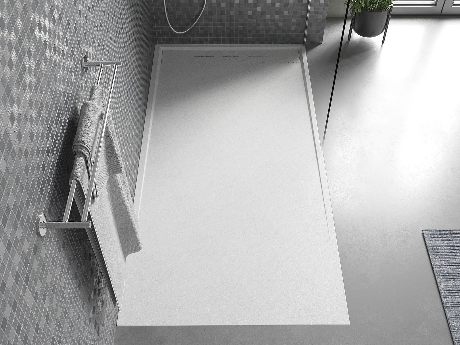 La surface du receveur de douche rappelle par sa structure la pierre. Elle constitue une combinaison exceptionnelle d'un aspect naturel et d'un aménagement intérieur moderne. Elle ajoute du caractère, souligne l'esthétique et l'élégance de la décoration de la salle de bains et séduit par sa forme.