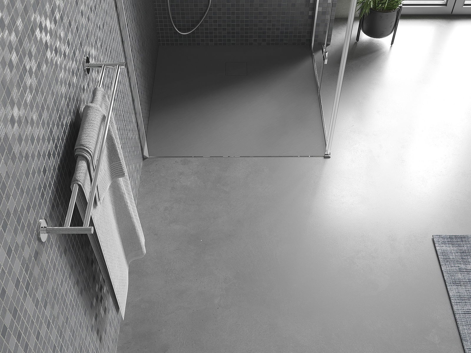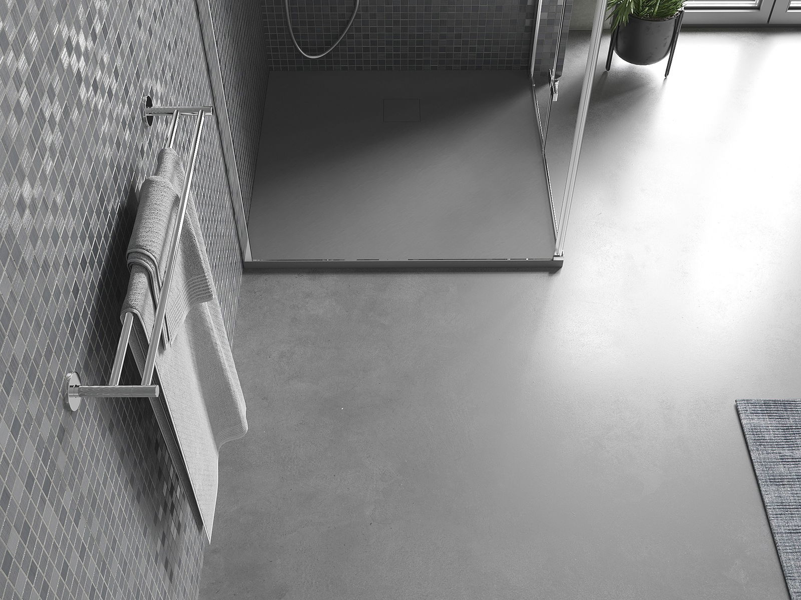 La surface du receveur de douche rappelle par sa structure la pierre. Elle constitue une combinaison exceptionnelle d'un aspect naturel et d'un aménagement intérieur moderne. Elle ajoute du caractère, souligne l'esthétique et l'élégance de la décoration de la salle de bains et séduit par sa forme.