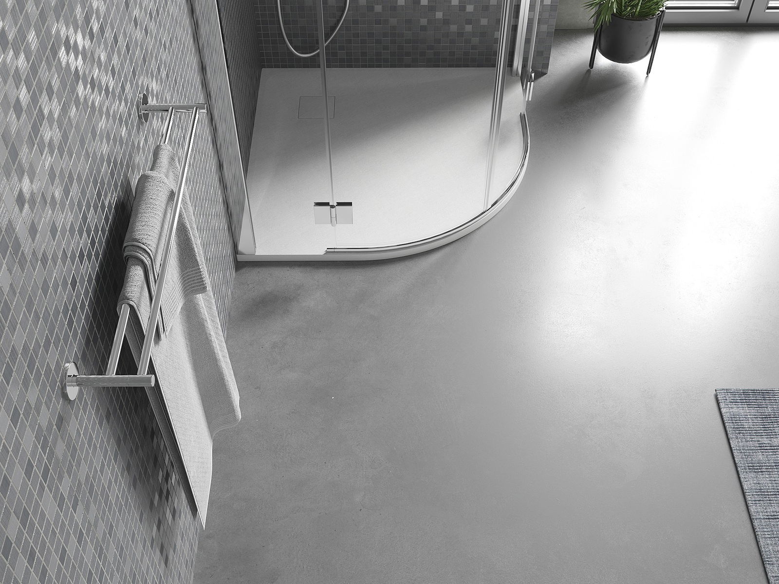 La surface du receveur de douche évoque la pierre. C'est une combinaison unique d'aspect naturel et de design intérieur moderne. Il ajoute du caractère, souligne l'esthétique et l'élégance de la salle de bains et séduit par sa forme.