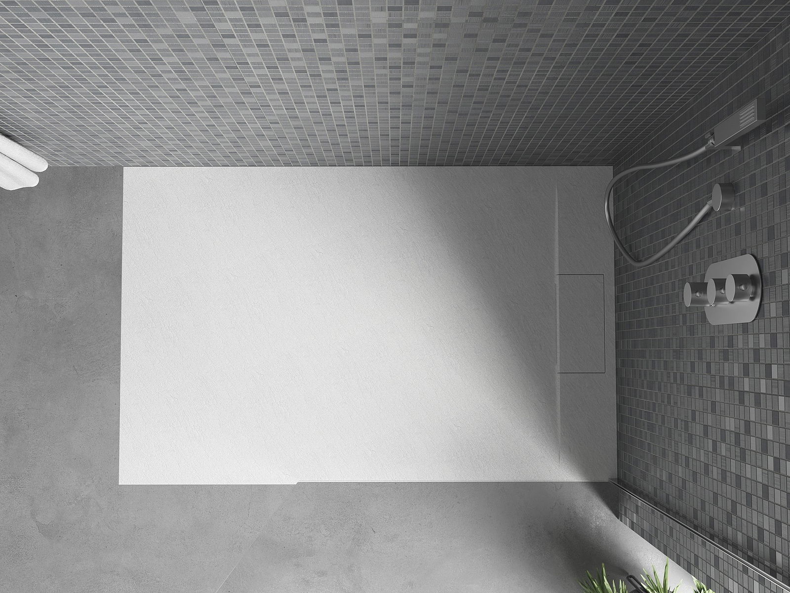 La surface du receveur de douche rappelle par sa structure la pierre. Elle constitue une combinaison exceptionnelle d'un aspect naturel et d'un aménagement intérieur moderne. Elle ajoute du caractère, souligne l'esthétique et l'élégance de la décoration de la salle de bains et séduit par sa forme.